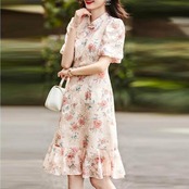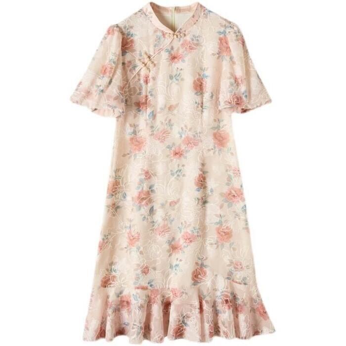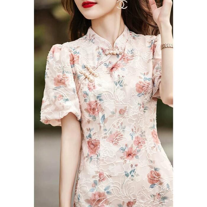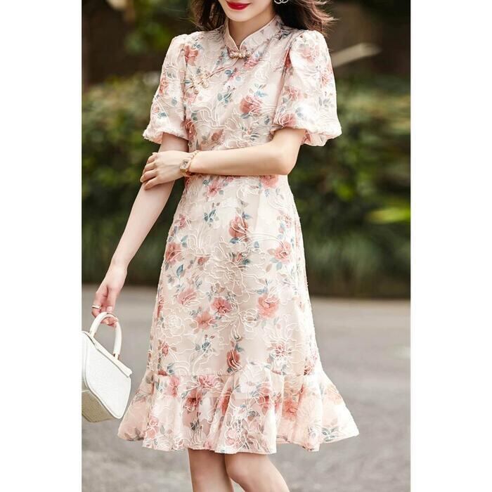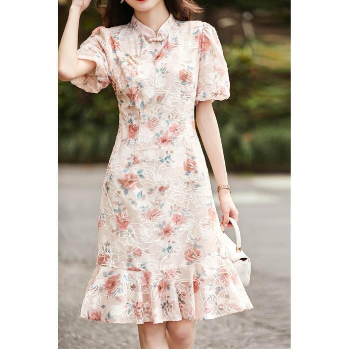 大きいサイズ パフスリーブ ワンピース ドレス 袖あり チャイナドレス フラワー 花柄 エレガント レディース きれいめ カジュアル おしゃれ 半袖 大人 可愛い フェミニン ひざ丈 フレア 体型カバー 上品 お呼ばれ ピンク 春 秋 夏 20代 30代 40代 50代