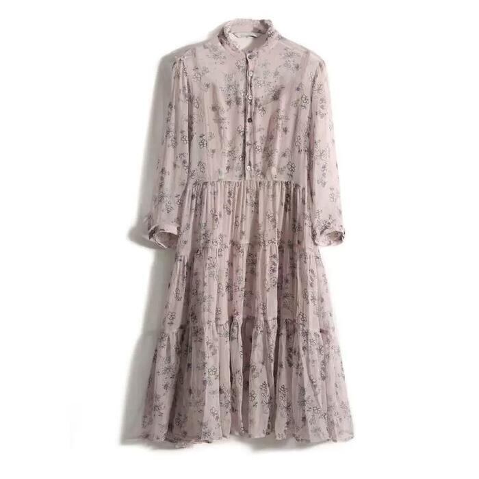 大きいサイズ ティアード ワンピース ドレス 袖あり 花柄 フラワー エレガント レディース きれいめ カジュアル おしゃれ 七分袖 大人 可愛い フェミニン ミモレ丈 ナチュラル 透け感 インナー ゆったり 体型カバー ピンク 春 秋 夏 20代 30代 40代 50代