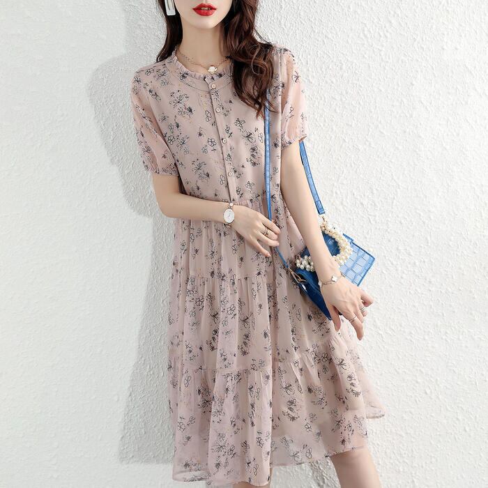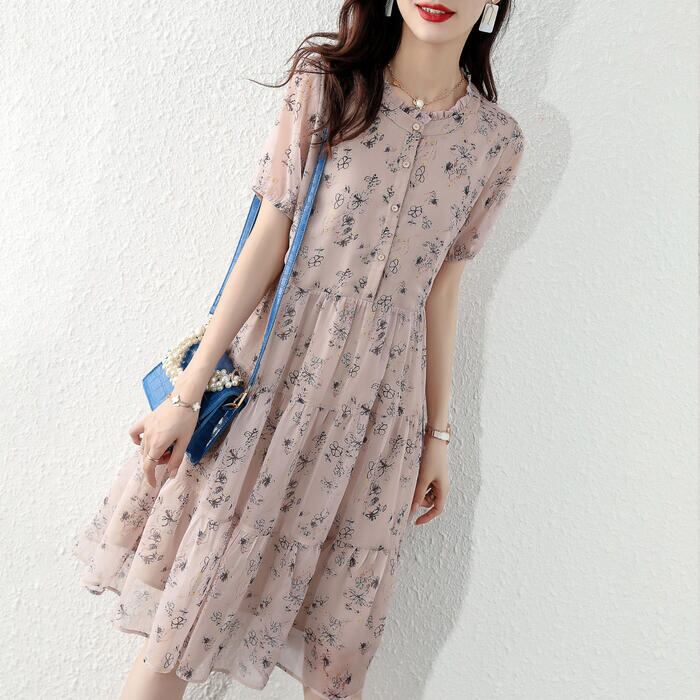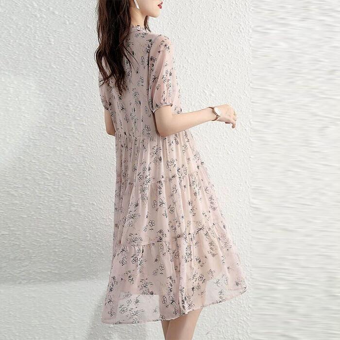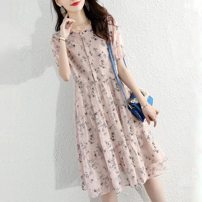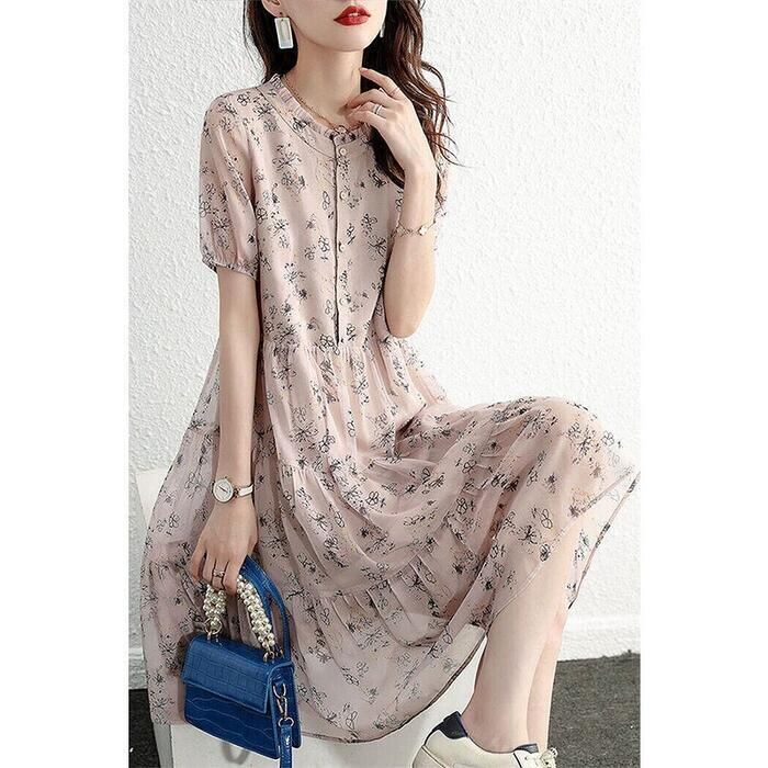 大きいサイズ ティアード ワンピース ドレス 袖あり 花柄 フラワー エレガント レディース きれいめ カジュアル おしゃれ 半袖 大人 可愛い フェミニン ひざ丈 ナチュラル シフォン ゆったり 体型カバー ピンク 春 秋 夏 20代 30代 40代 50代