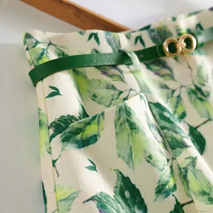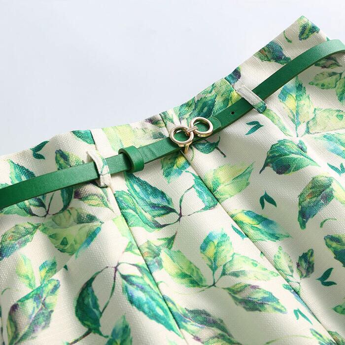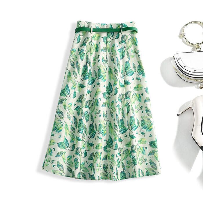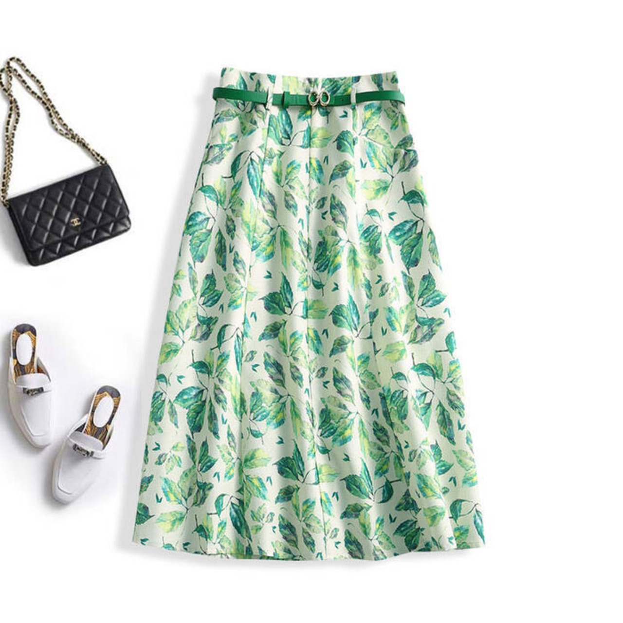 爽やかなリーフプリントが目を惹くミモレ丈スカート。