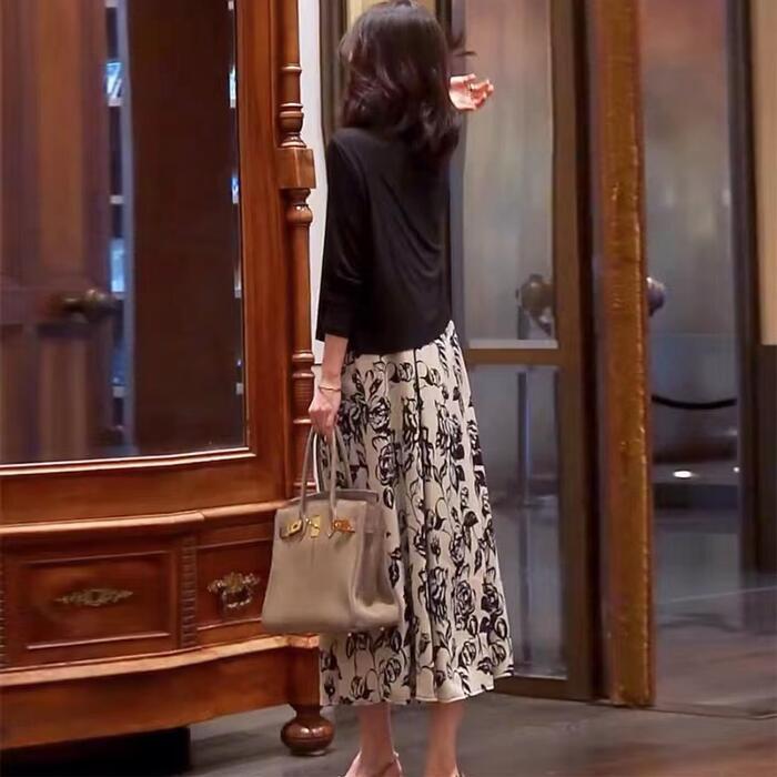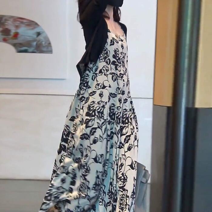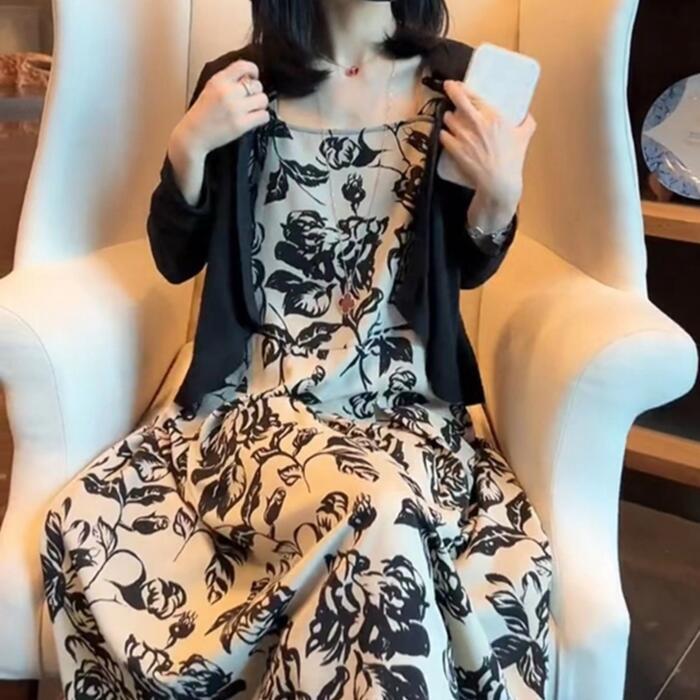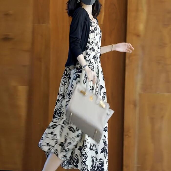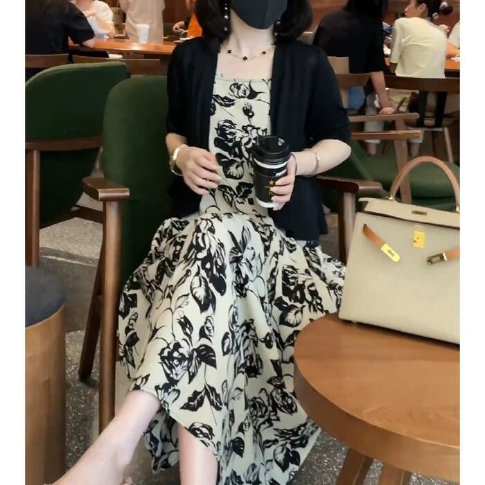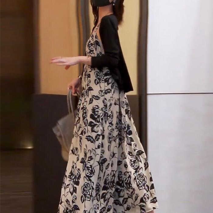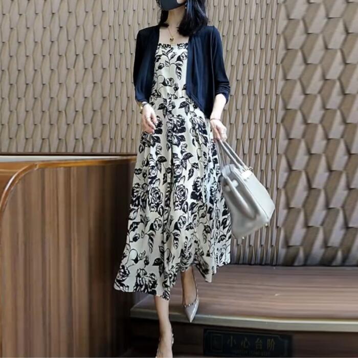 シックなフラワープリントのキャミワンピースとカーディガンのセット。