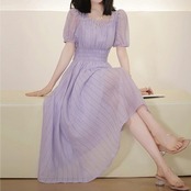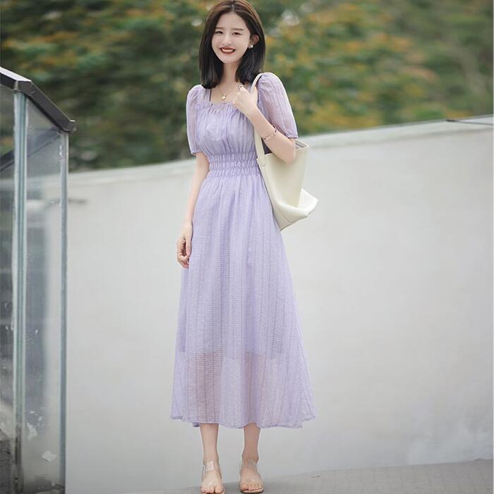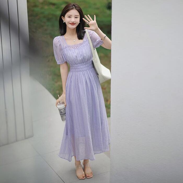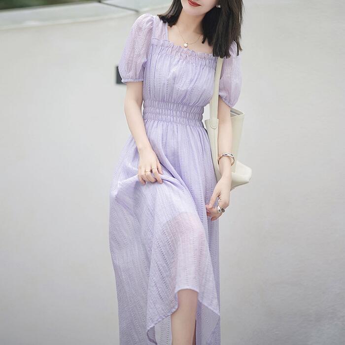 大きいサイズ パフスリーブ ワンピース ドレス 袖あり レース エレガント レディース きれいめ カジュアル おしゃれ 半袖 大人 可愛い フェミニン ミモレ丈 体型カバー スクエアネック ナチュラル ハイウエスト 韓国 ベージュ パープル 春 秋 夏 20代 30代 40代 50代