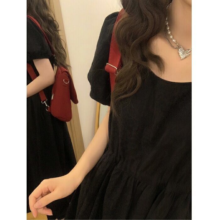 パフスリーブが可愛いシンプルなブラックワンピース。