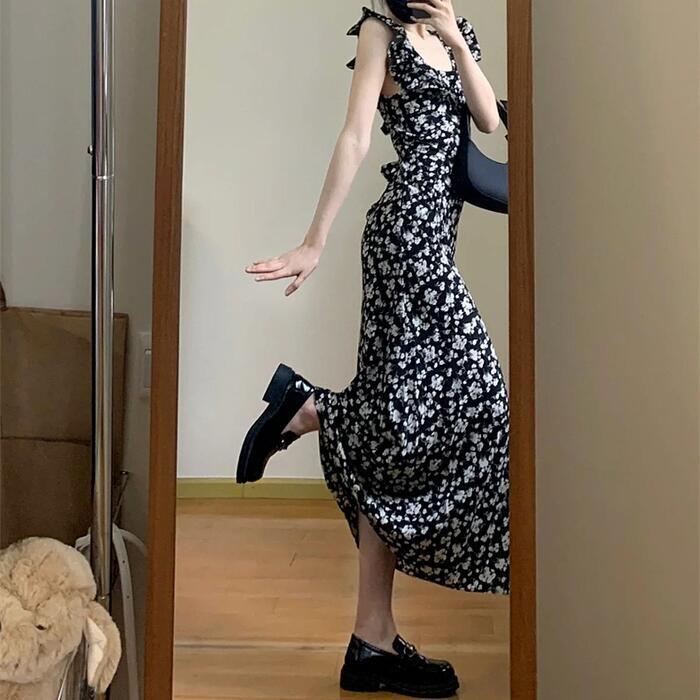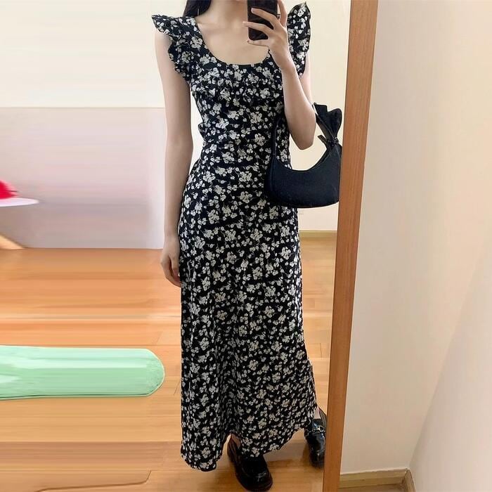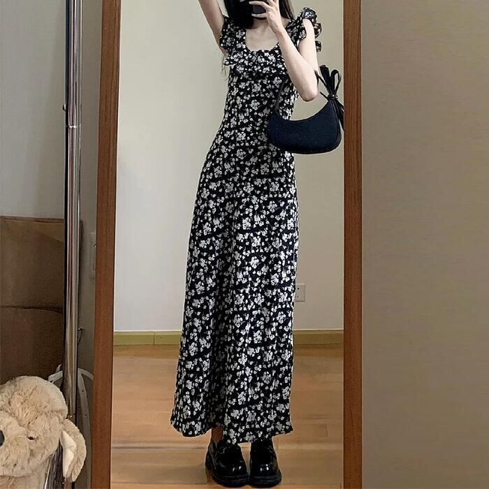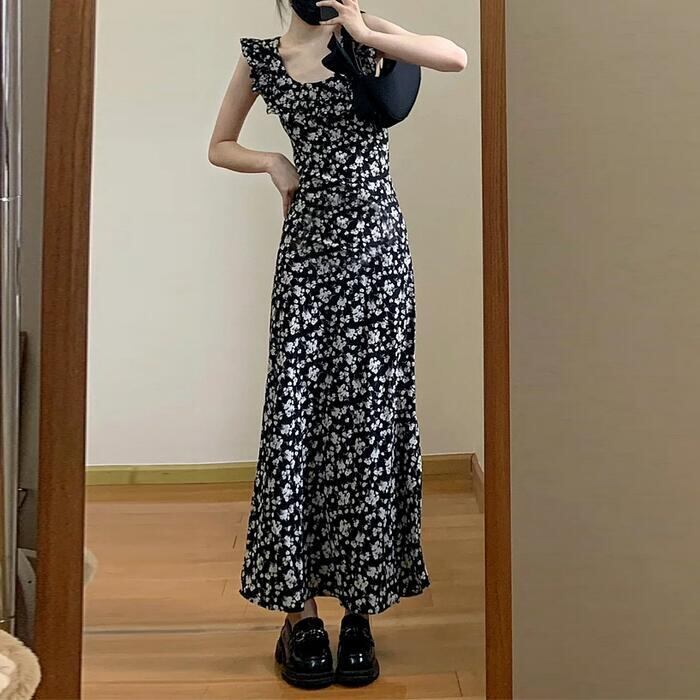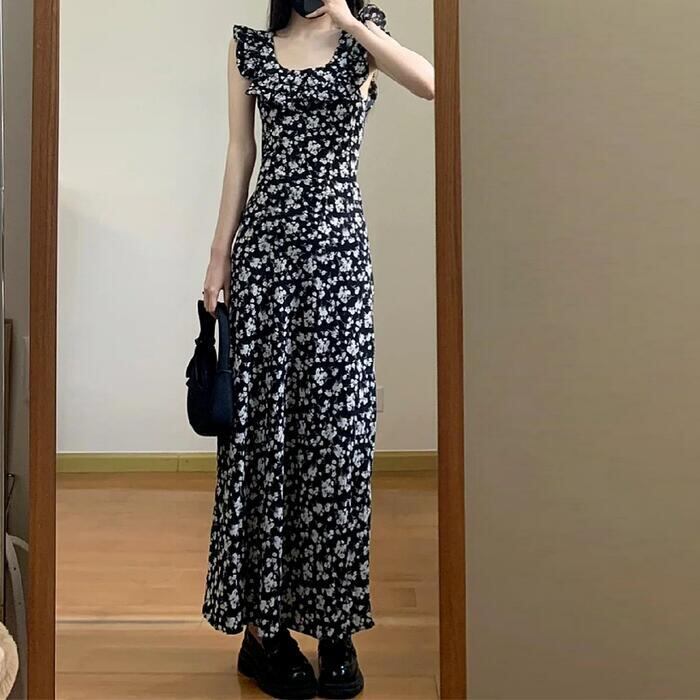 大きいサイズ ワンピース ドレス 花柄 フラワー フリル エレガント レディース きれいめ カジュアル おしゃれ ノースリーブ 大人 可愛い フェミニン ロング丈 スリム Aライン ハイウエスト 体型カバー 韓国 ブラック 黒 春 秋 夏 20代 30代 40代 50代