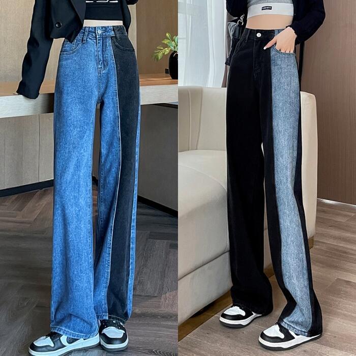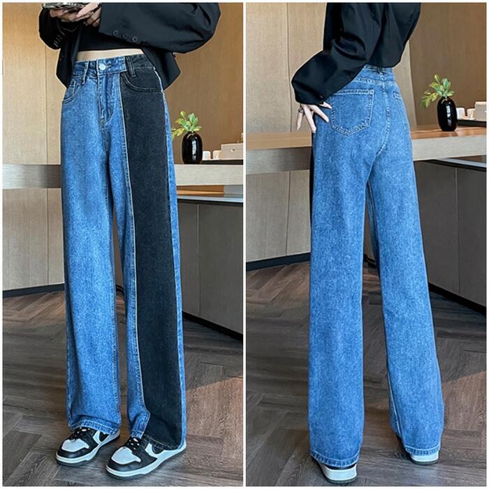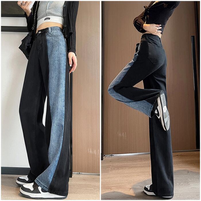 全2種2色 大きいサイズ パンツ ボトムス デニム アシンメトリー ワイドパンツ レディース きれいめ カジュアル 色落ち おしゃれ ロング丈 大人 可愛い フェミニン かっこいい 体型カバー モード 韓国 ブルー 青 ブラック 黒 春 夏 秋 冬 20代 30代 40代 50代