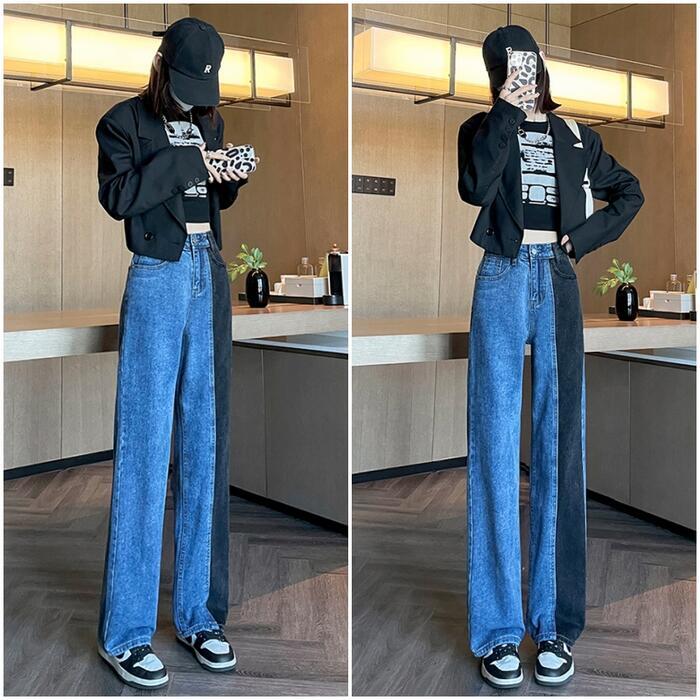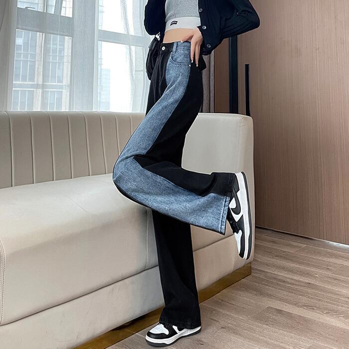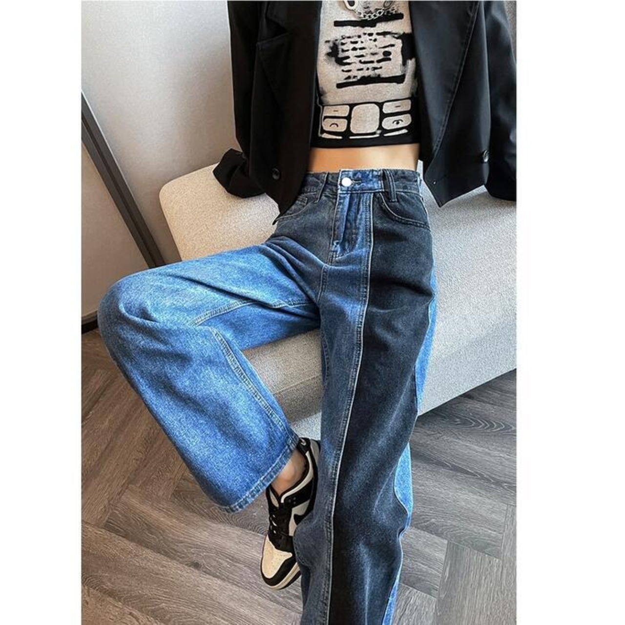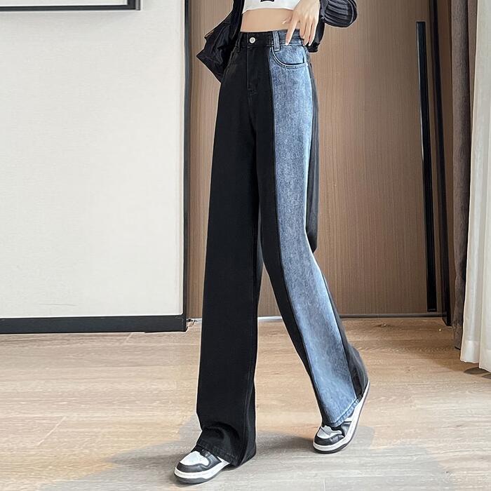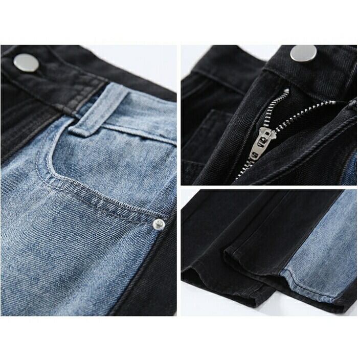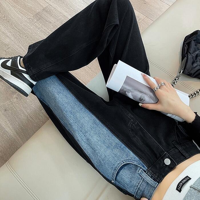左右のカラーを変えたアシンメトリーデザインのデニムパンツ。
