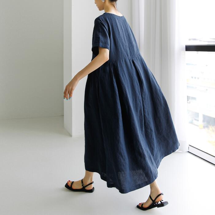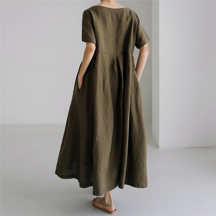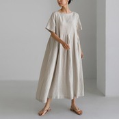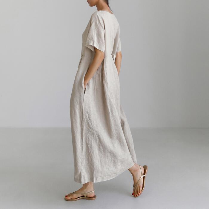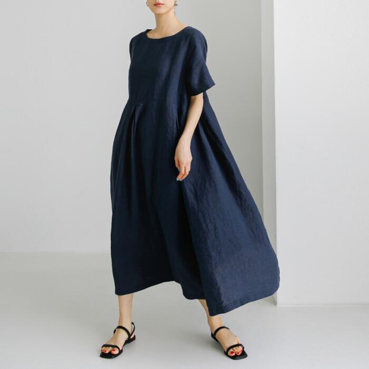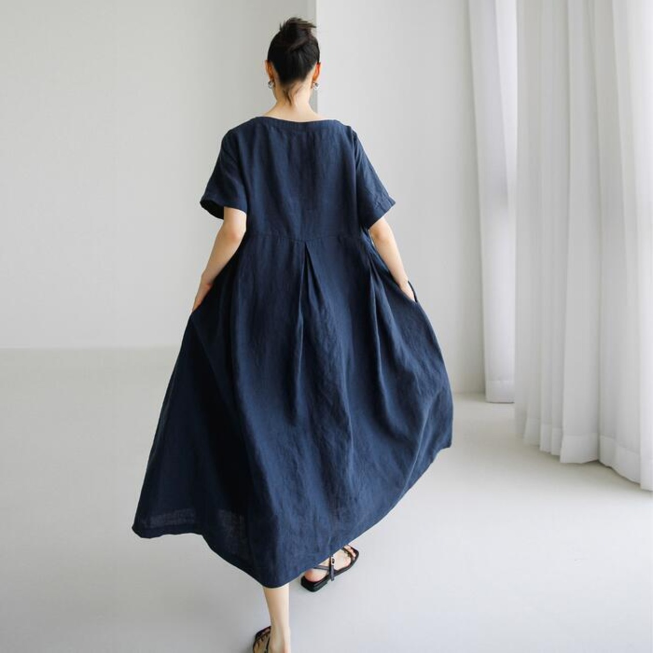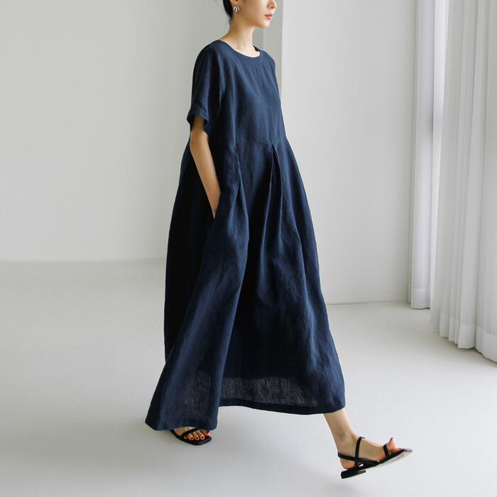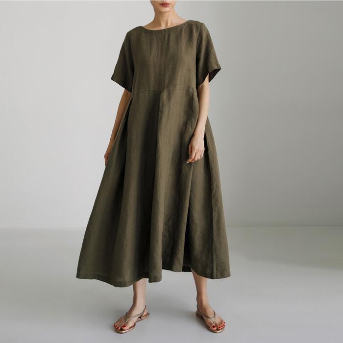 全3色 大きいサイズ 体型カバー 綿麻 ワンピース ドレス 袖あり リネン混 コットンリネン レディース きれいめ カジュアル おしゃれ 半袖 大人 可愛い フェミニン ロング丈 シンプル ゆったり ナチュラル リラックス ネイビー グリーン 緑 ベージュ 春 秋 夏 20代 30代 40代 50代