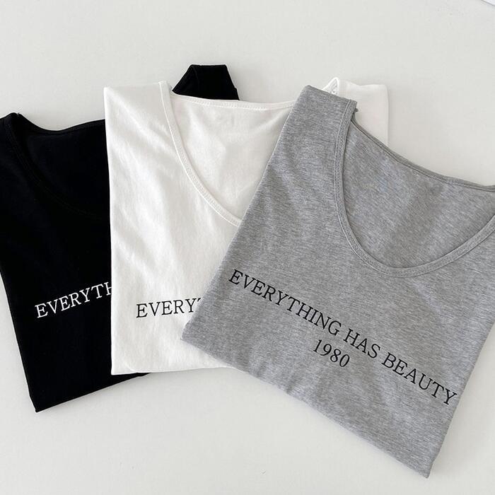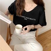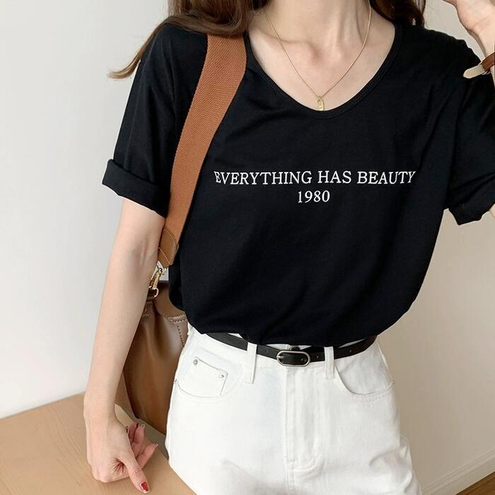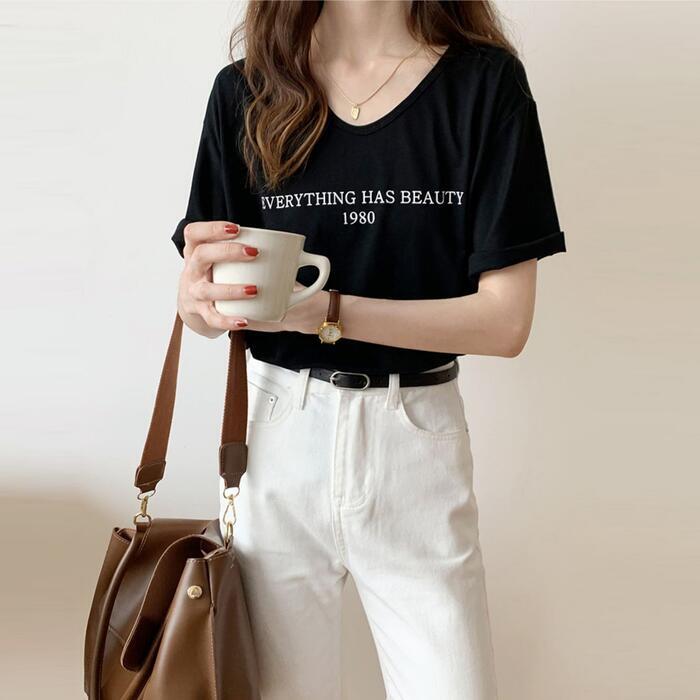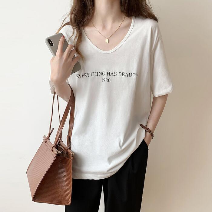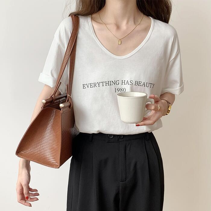 Uネックがフェミニンな雰囲気の半袖ロゴTシャツ。