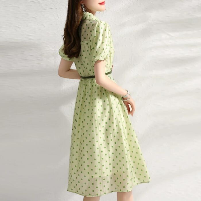 爽やかなグリーンカラーのドット柄ワンピース。