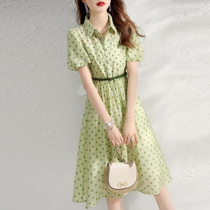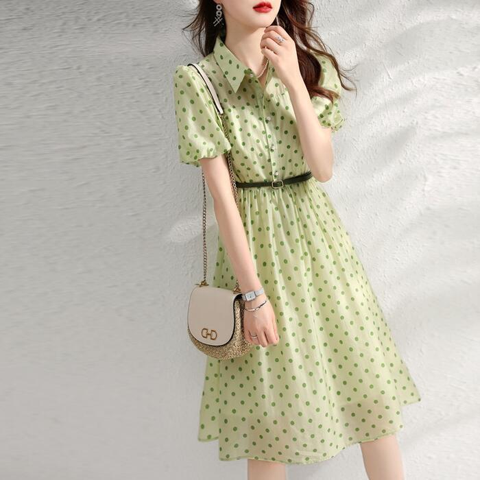大きいサイズ パフスリーブ ワンピース ドット柄 シャツワンピ エレガント レディース きれいめ カジュアル おしゃれ ひざ丈 大人 可愛い フェミニン ウエストベルト 体型カバー ナチュラル Aライン グリーン 緑 春 夏 秋 冬 20代 30代 40代 50代