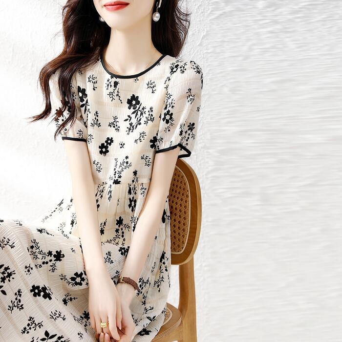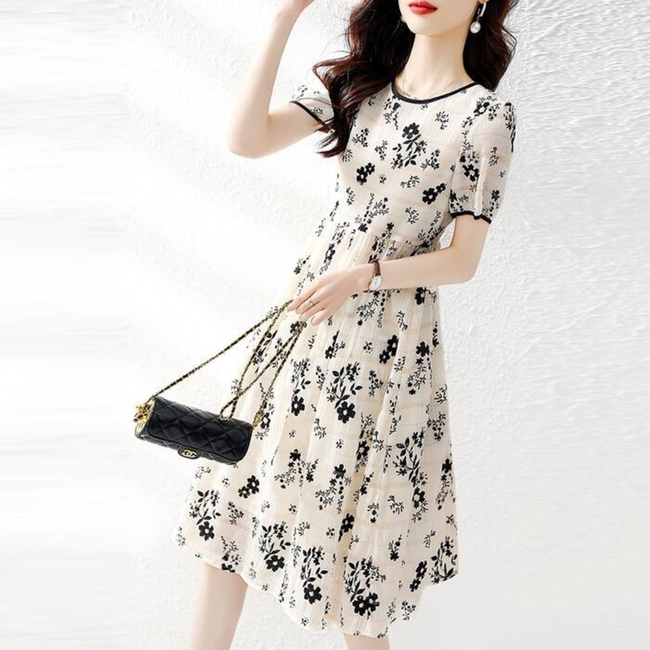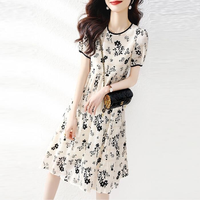 花柄にさりげないボーダー柄を合わせたフェミニンな印象のワンピース。