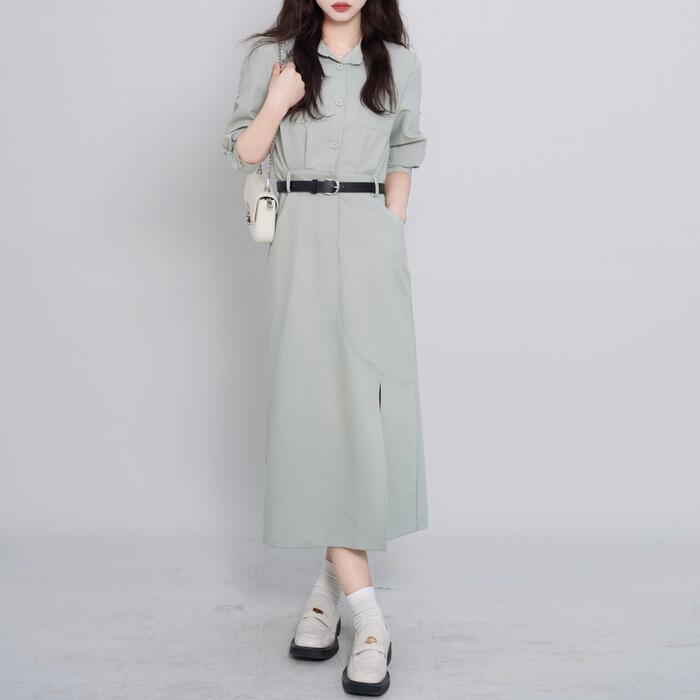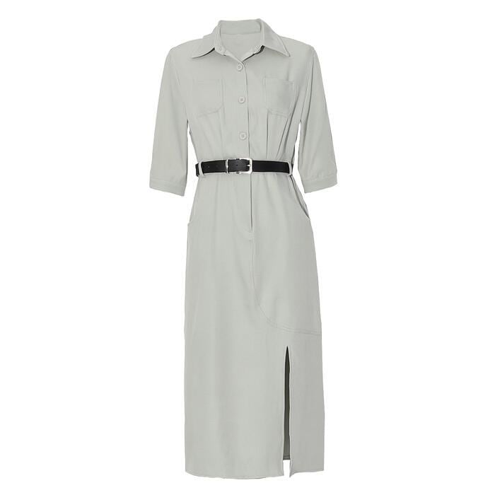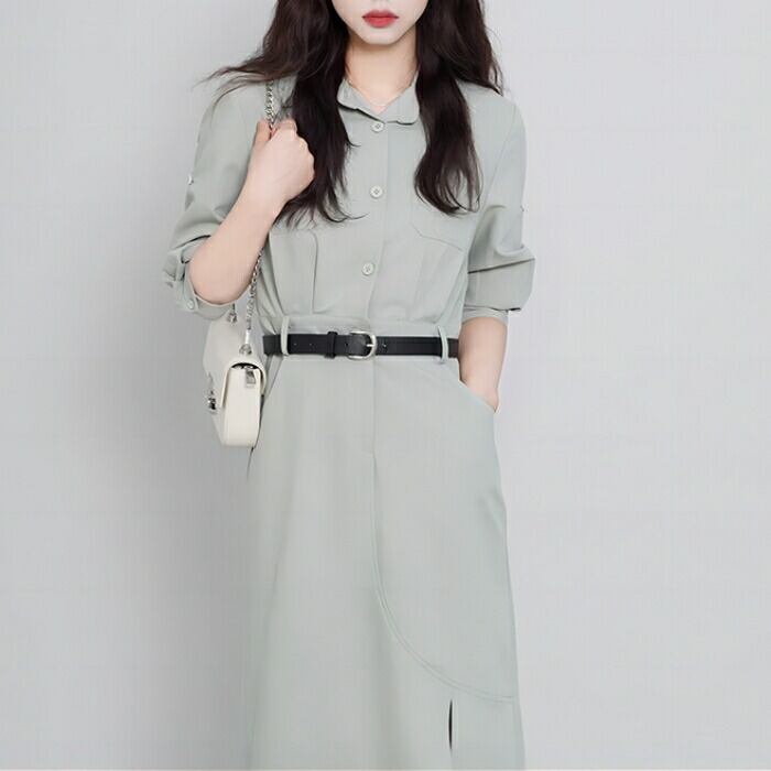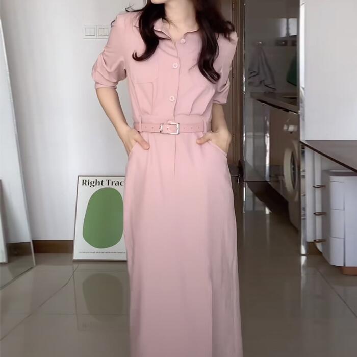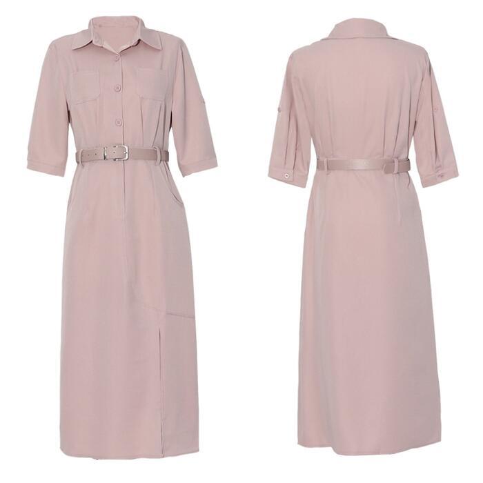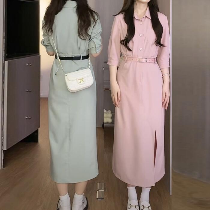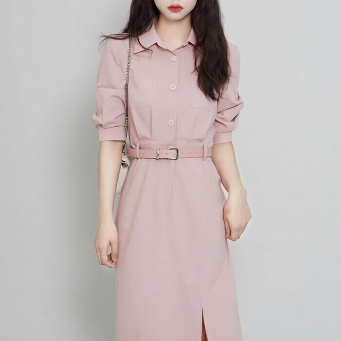全2色 ワンピース ドレス レディース エレガント きれいめ カジュアル おしゃれ ミモレ丈 大人 可愛い 半袖 五分袖 シャツワンピ フェミニン タイト ウエストベルト シンプル 通勤 オフィス スリット ピンク グリーン 緑 春 夏 秋 20代 30代 40代 50代