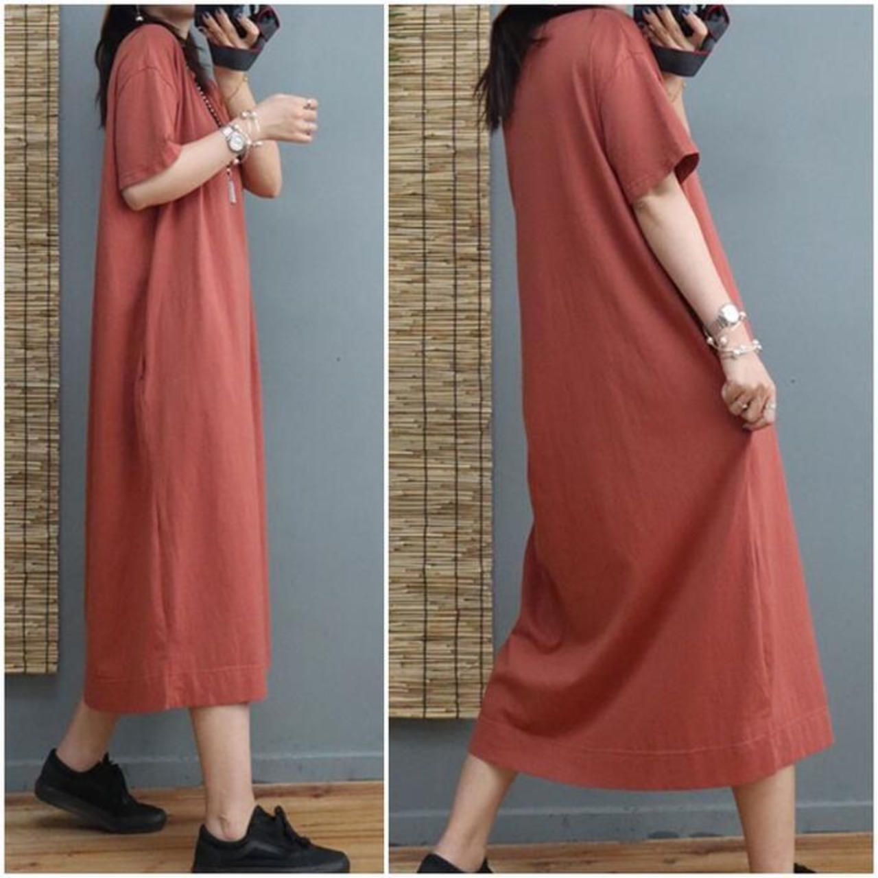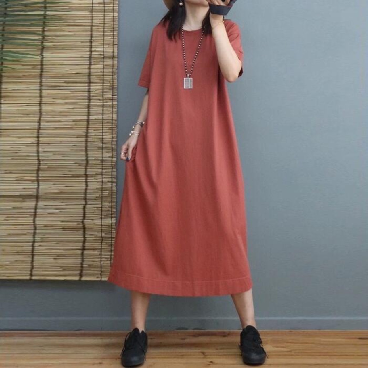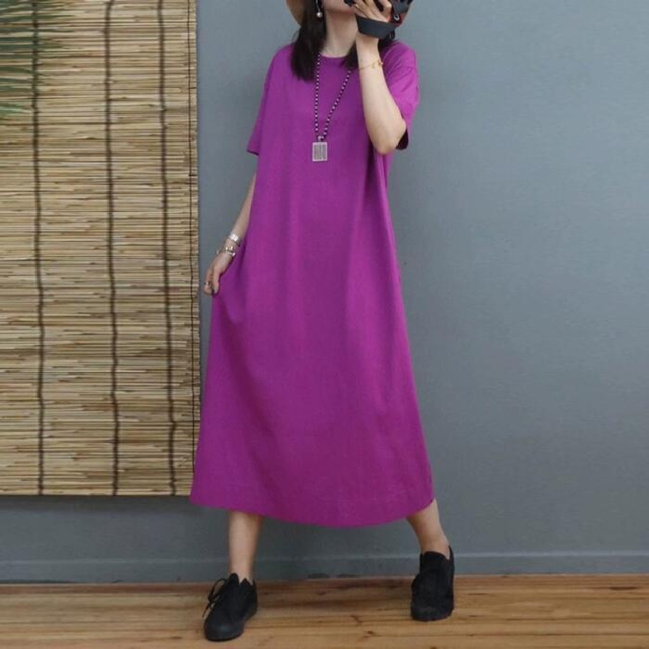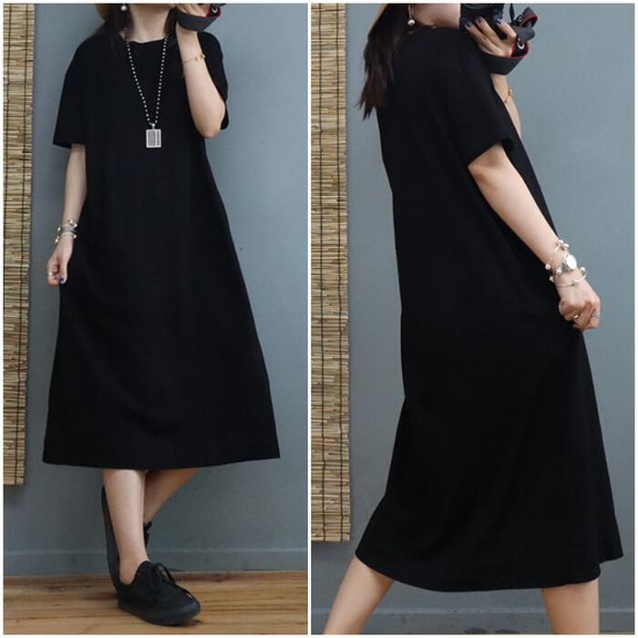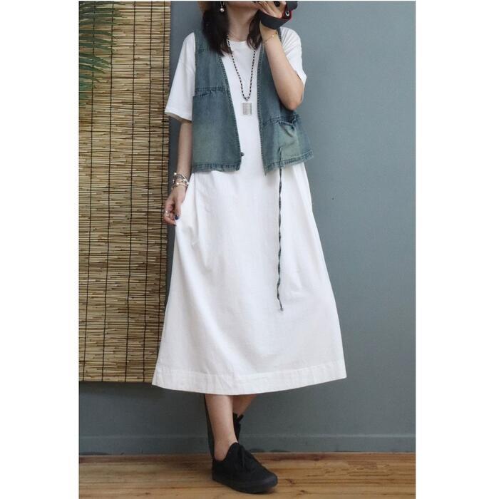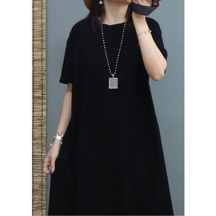 身体のラインを拾わないゆったりシルエットのワンピース。