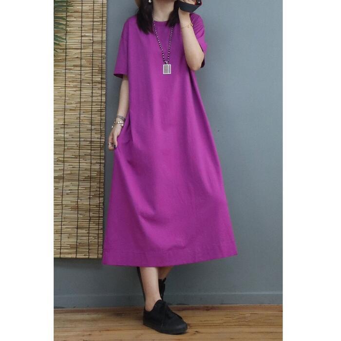 全4色 大きいサイズ ワンピース ドレス Tシャツワンピ レディース きれいめ カジュアル ミモレ丈 大人 可愛い 半袖 フェミニン Aライン 体型カバー ゆったり シンプル ナチュラル パープル ブラウン ホワイト 白 ブラック 黒 春 夏 秋 20代 30代 40代 50代