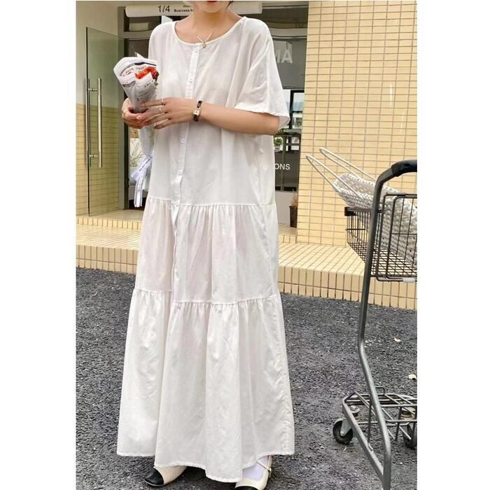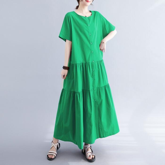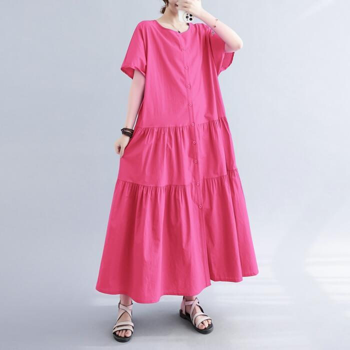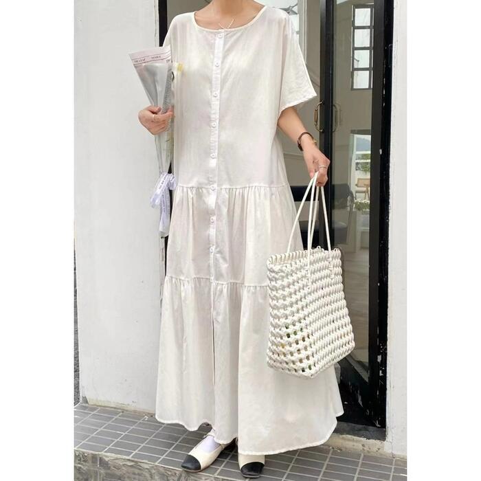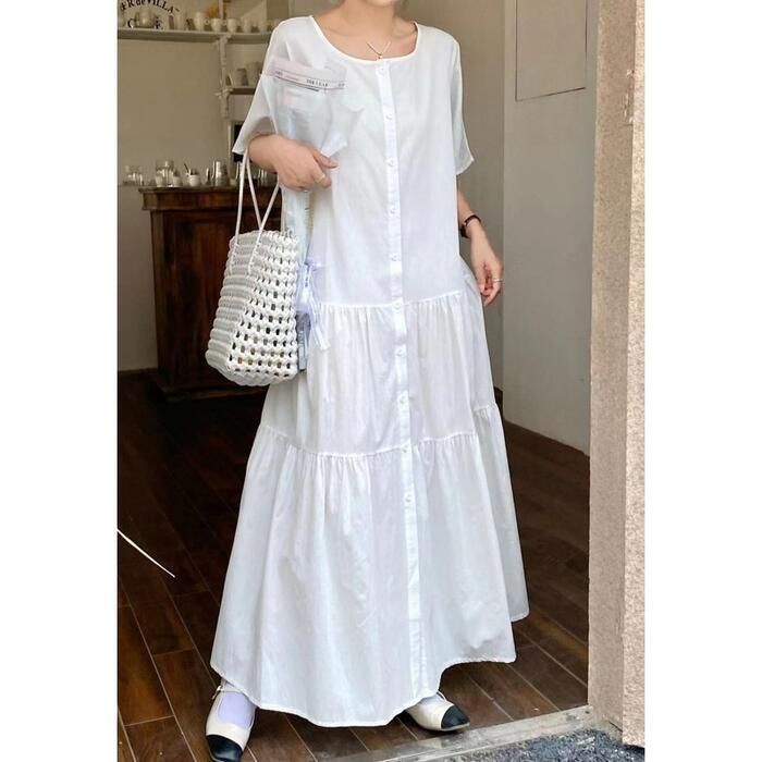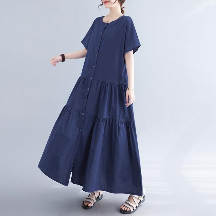 全4色 ティアード ワンピース ドレス 袖あり レディース きれいめ カジュアル ロング丈 大人 可愛い 半袖 フェミニン Aライン フロントボタン 体型カバー ゆったり リラックス ピンク グリーン 緑 ホワイト 白 ネイビー 春 夏 秋 20代 30代 40代 50代