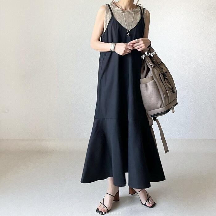 全2色 ワンピース ドレス キャミワンピース フレア レディース きれいめ カジュアル ロング丈 大人 可愛い ノースリーブ レイヤード フェミニン Aライン ゆったり 体型カバー 韓国 グリーン 緑 ブラック 黒 春 夏 秋 20代 30代 40代 50代