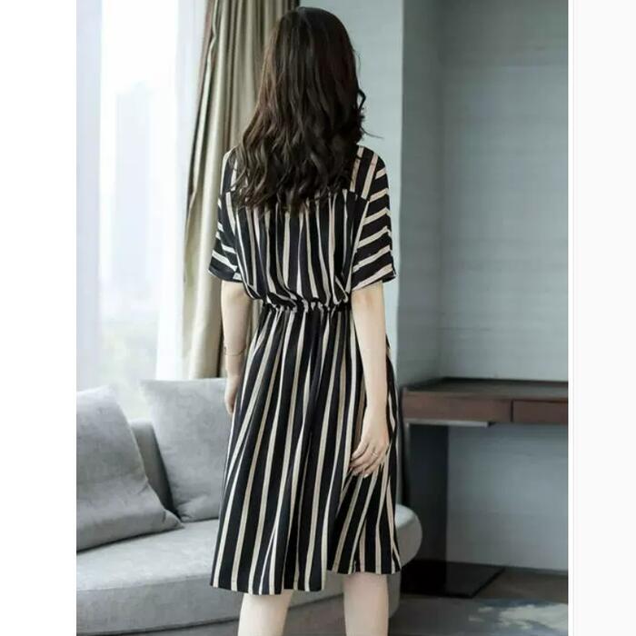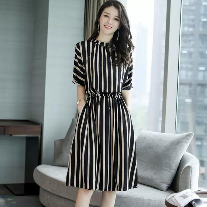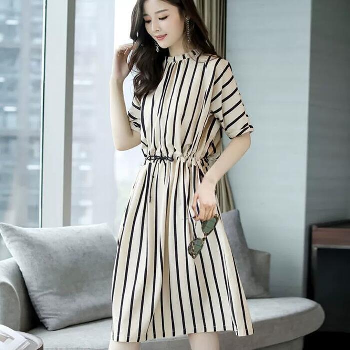 全2色 大きいサイズ ワンピース ドレス 袖あり ストライプ レディース エレガント きれいめ カジュアル ひざ丈 大人 可愛い 半袖 フェミニン Aライン ドロスト ゆったり 体型カバー 通勤 オフィス ベージュ ブラック 黒 春 夏 秋 20代 30代 40代 50代