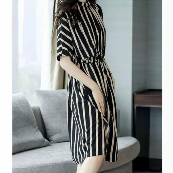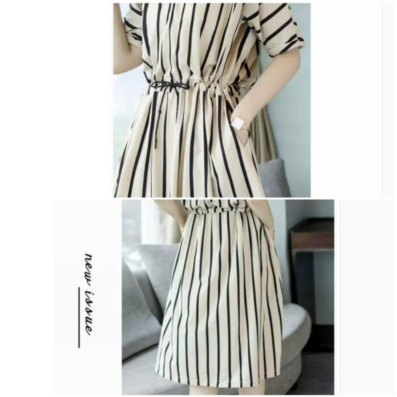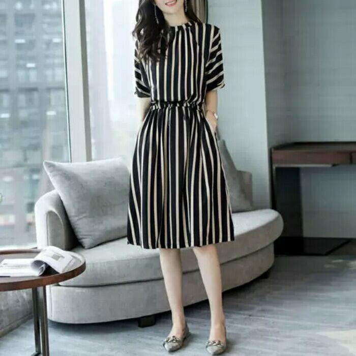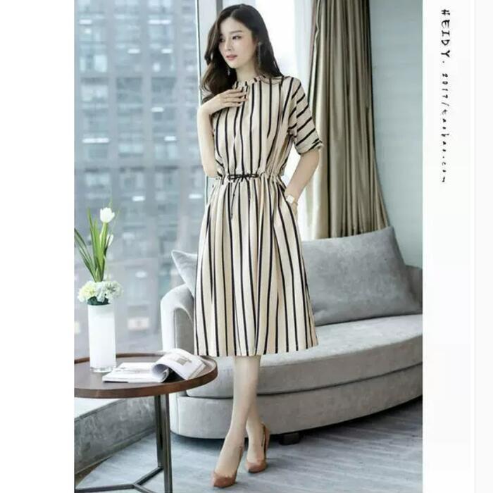スタイリングに上品な印象を演出するストライプ柄ワンピース。