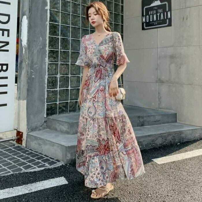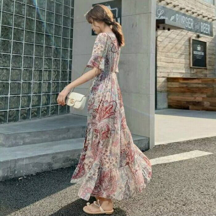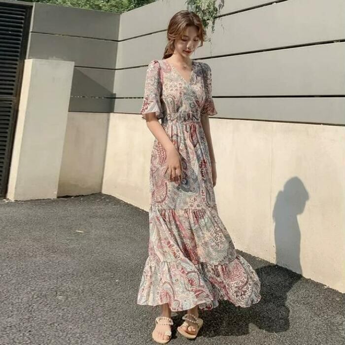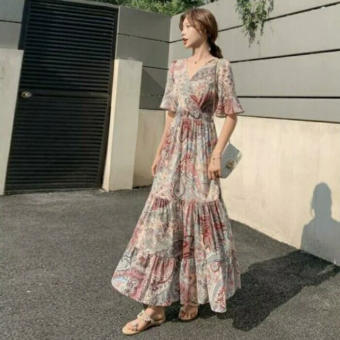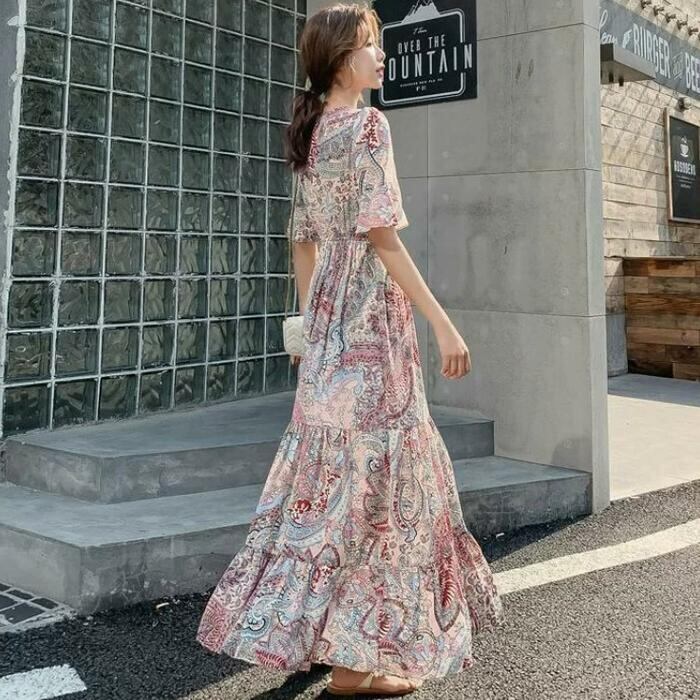 ペイズリー柄のティアードワンピース。