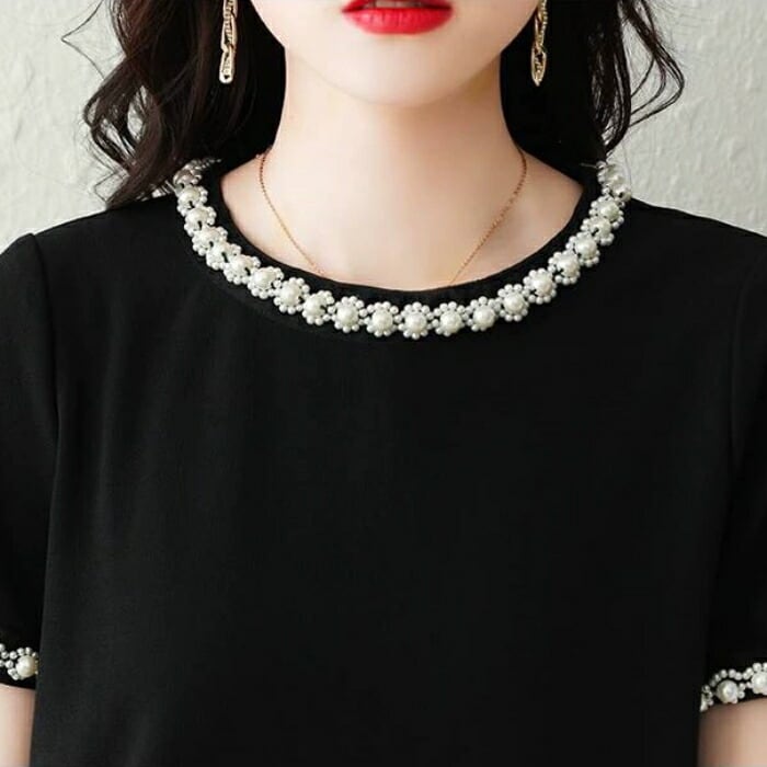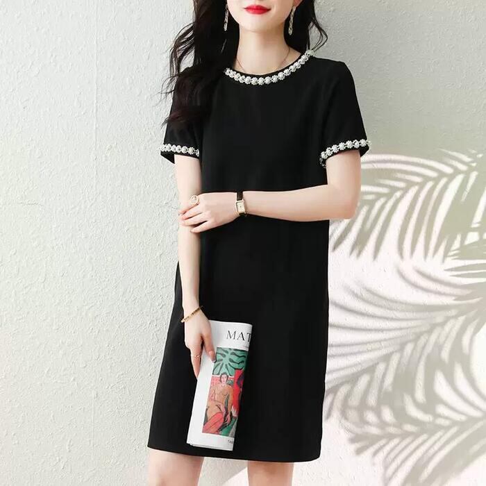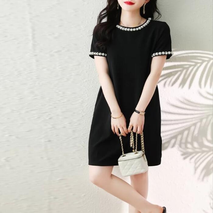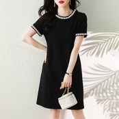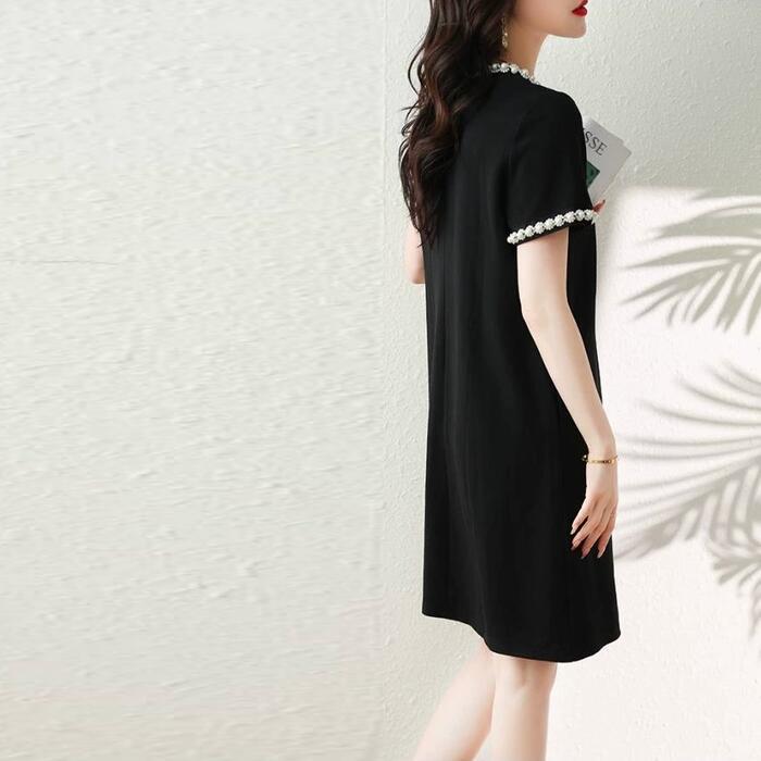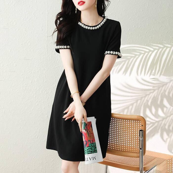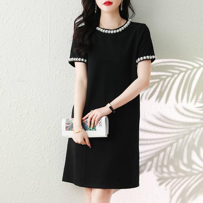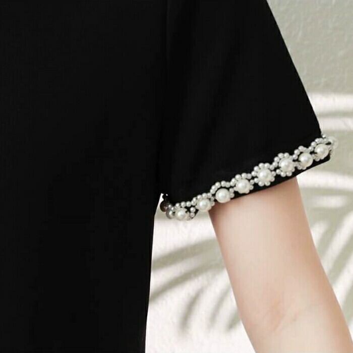 大きいサイズ ワンピース ドレス レディース 袖あり パール ビジュー エレガント きれいめ カジュアル ひざ丈 ミニ丈 大人 可愛い 半袖 フェミニン シンプル ゆったり 体型カバー お呼ばれ パーティー 二次会 ブラック 黒 春 夏 秋 20代 30代 40代 50代