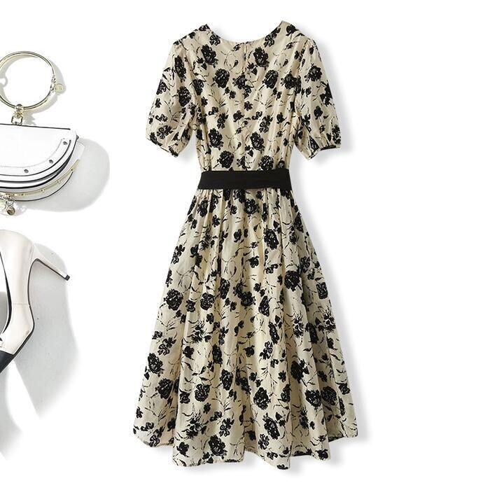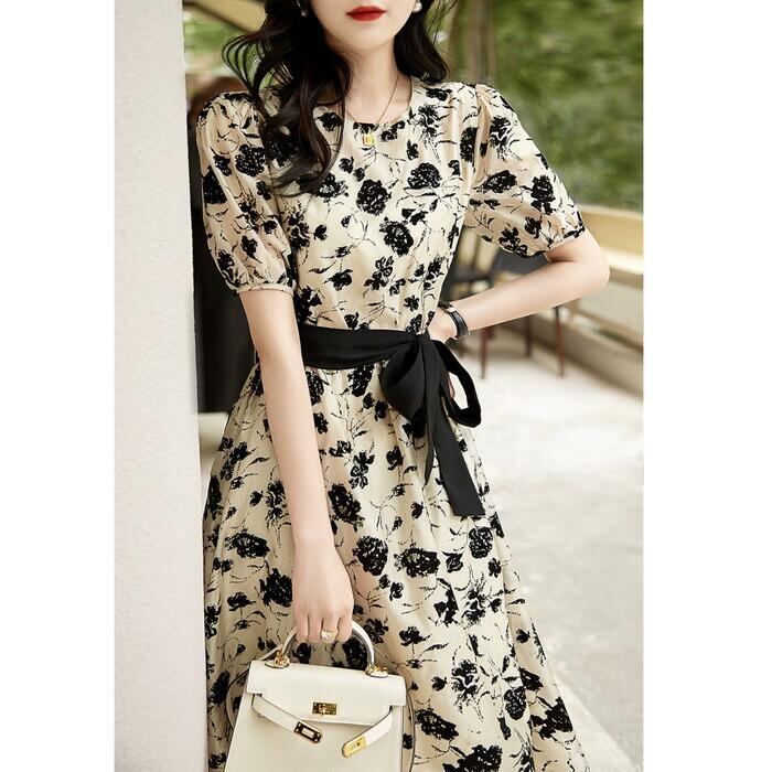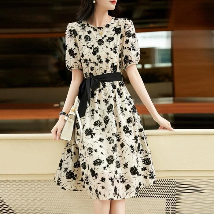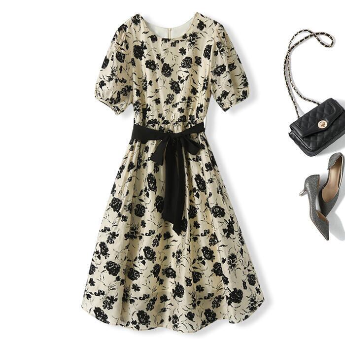 大きいサイズ パフスリーブ ワンピース ドレス 花柄 フラワー レディース エレガント きれいめ カジュアル ミモレ丈 ひざ丈 大人 可愛い 半袖 フェミニン クラシカル Aライン ウエストリボン 体型カバー お呼ばれ ホワイト 白 春 夏 秋 20代 30代 40代 50代