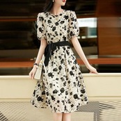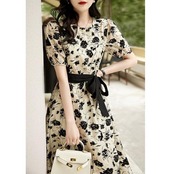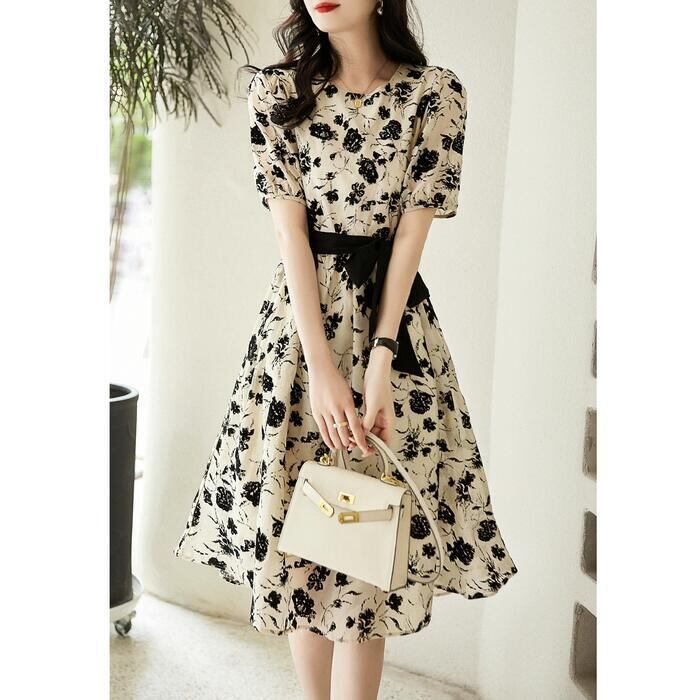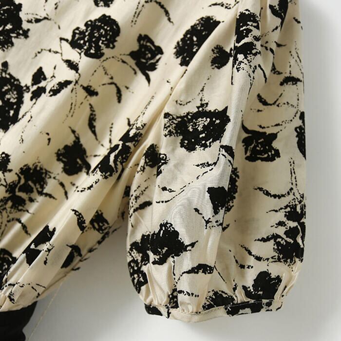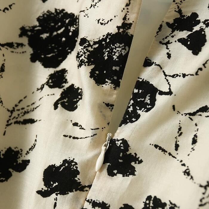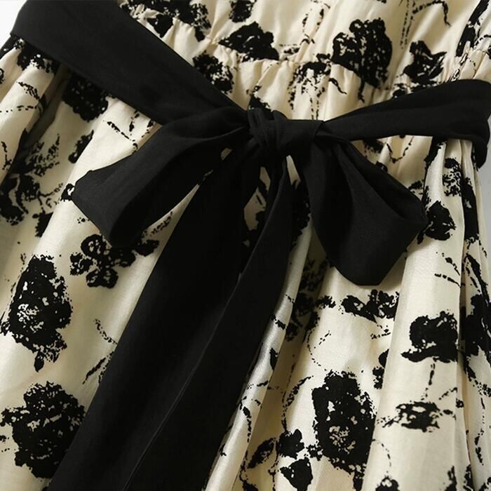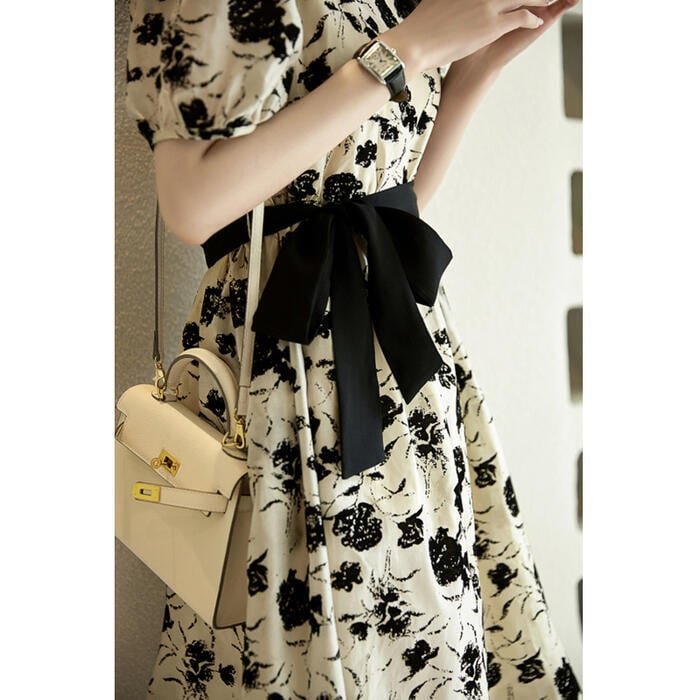 落ち着いたモノトーンカラーのフラワープリントワンピース。
