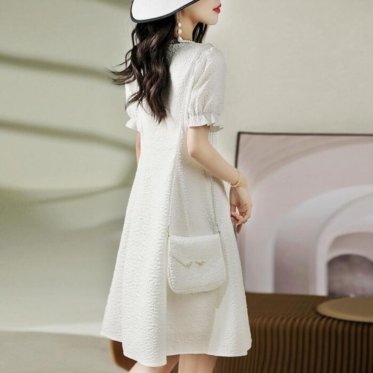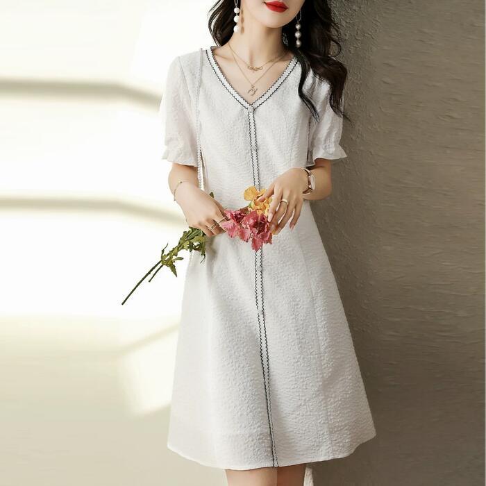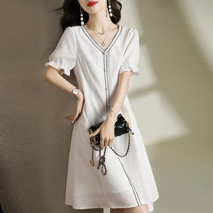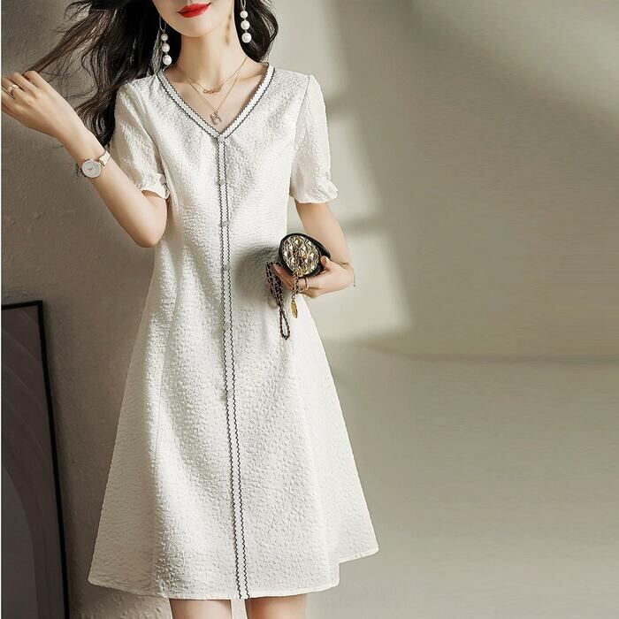 大きいサイズ パフスリーブ ワンピース ドレス 袖あり レディース エレガント きれいめ カジュアル ひざ丈 大人 可愛い 半袖 フェミニン クラシカル Aライン ジャガード 体型カバー 上品 お呼ばれ ホワイト 白 春 夏 秋 20代 30代 40代 50代