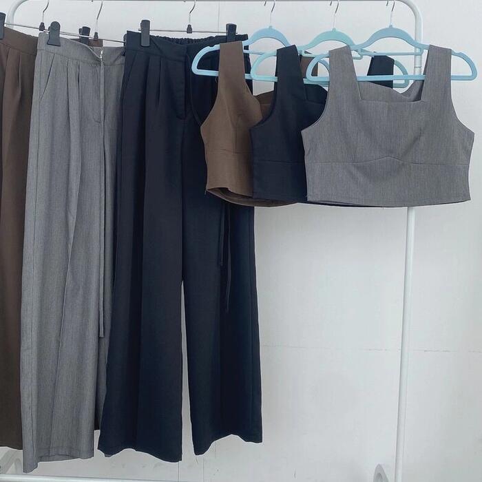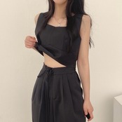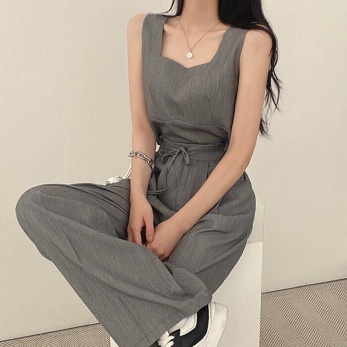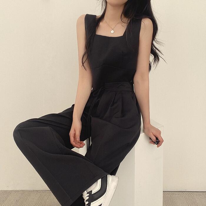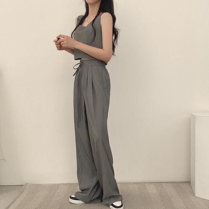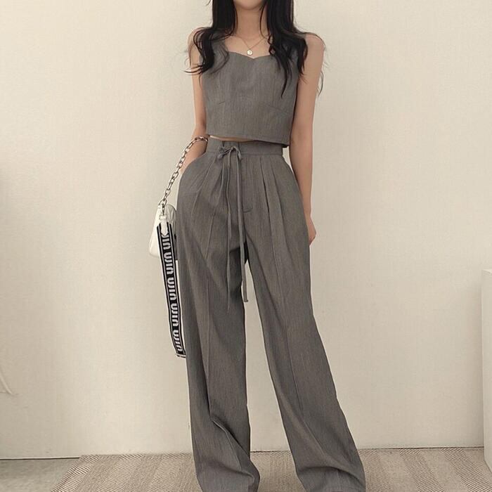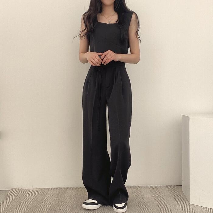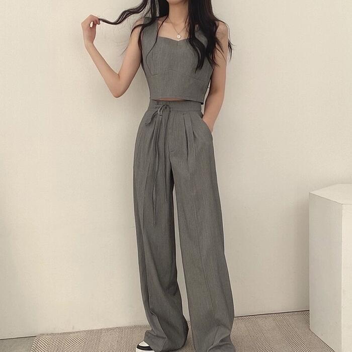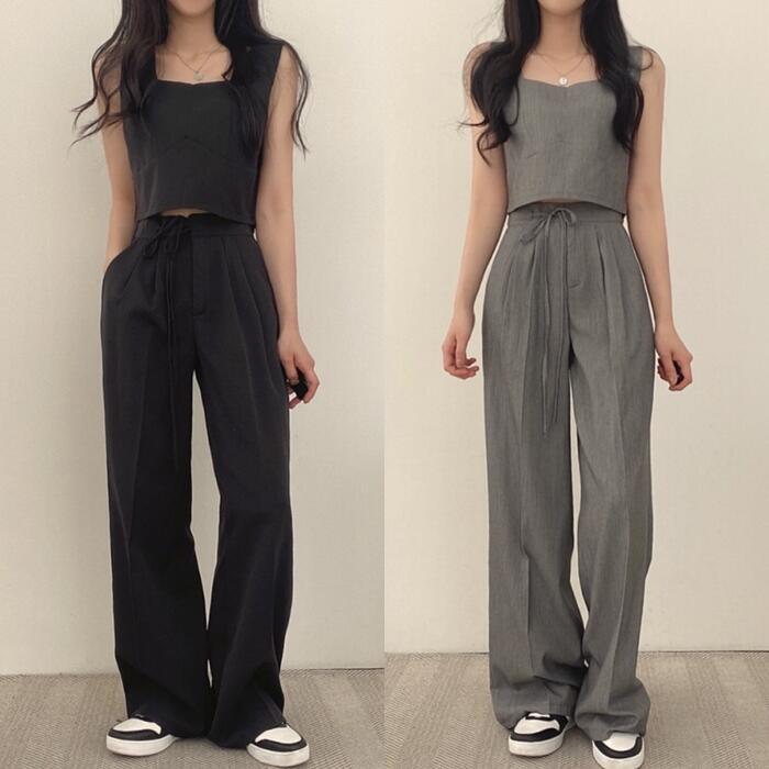 全2色 かっこいい セットアップ 2点セット トップス パンツ クロップド丈 ロングパンツ ノースリーブ レディース きれいめ カジュアル 大人 可愛い おしゃれ シンプル ナチュラル マニッシュ 韓国 体型カバー グレー ブラック 黒 春 夏 秋 20代 30代 40代 50代