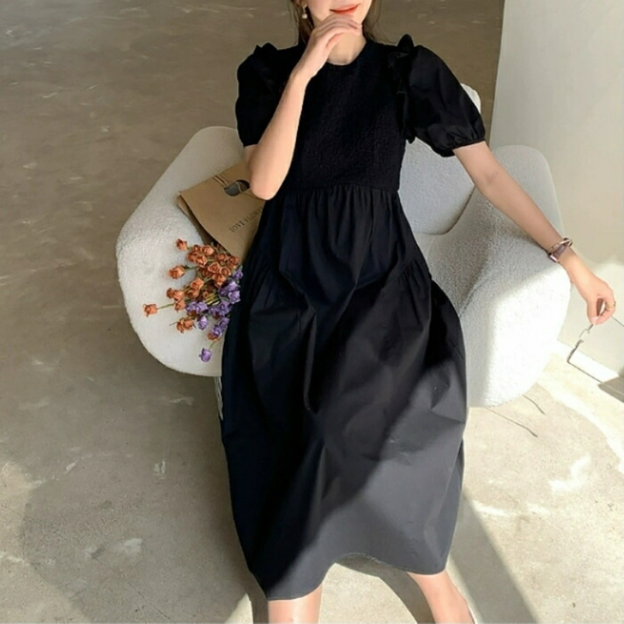 異素材ミックスが新鮮なパフスリーブワンピース。