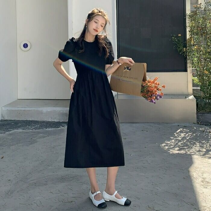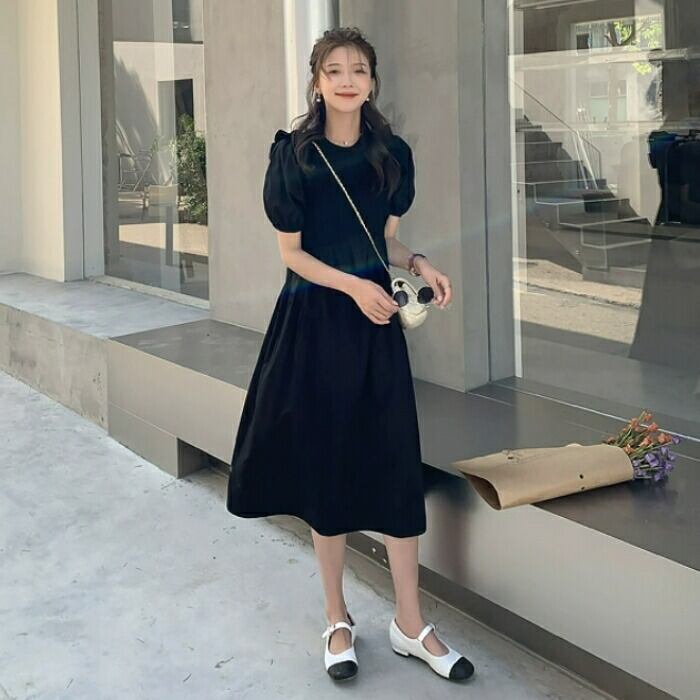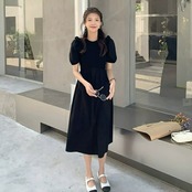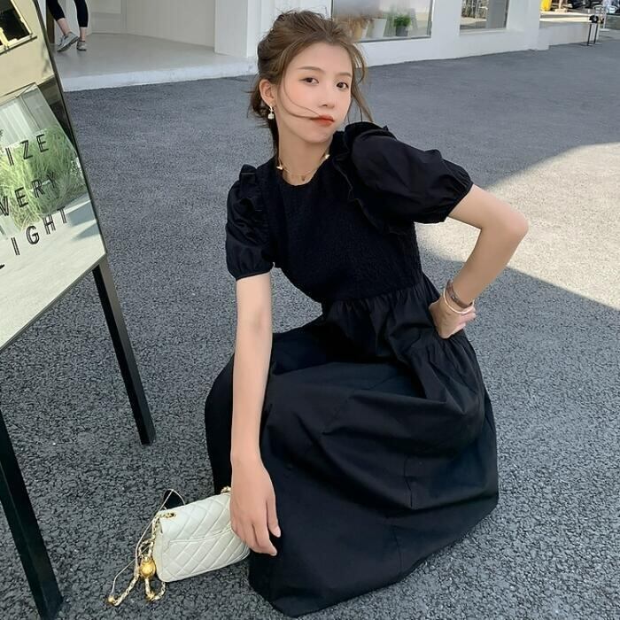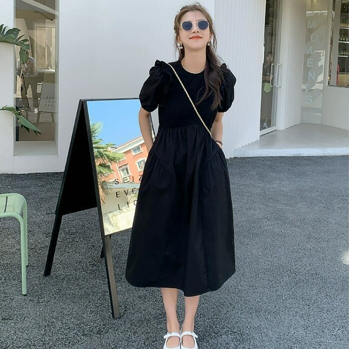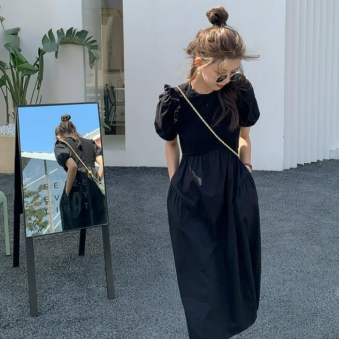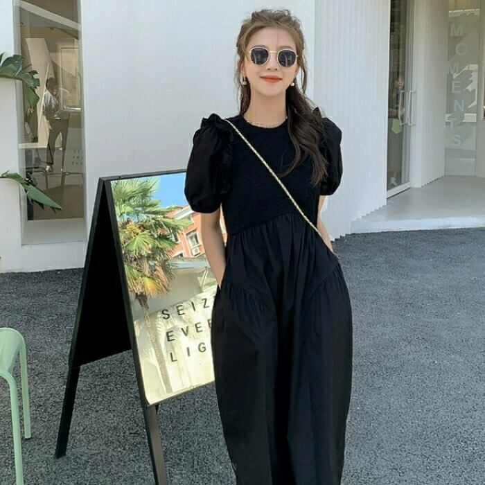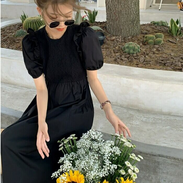 大きいサイズ パフスリーブ ワンピース ドレス 袖あり フリル レディース エレガント きれいめ カジュアル ミモレ丈 大人 可愛い 半袖 フェミニン クラシカル Aライン 異素材ミックス 体型カバー ブラック 黒 春 夏 秋 20代 30代 40代 50代