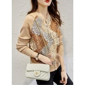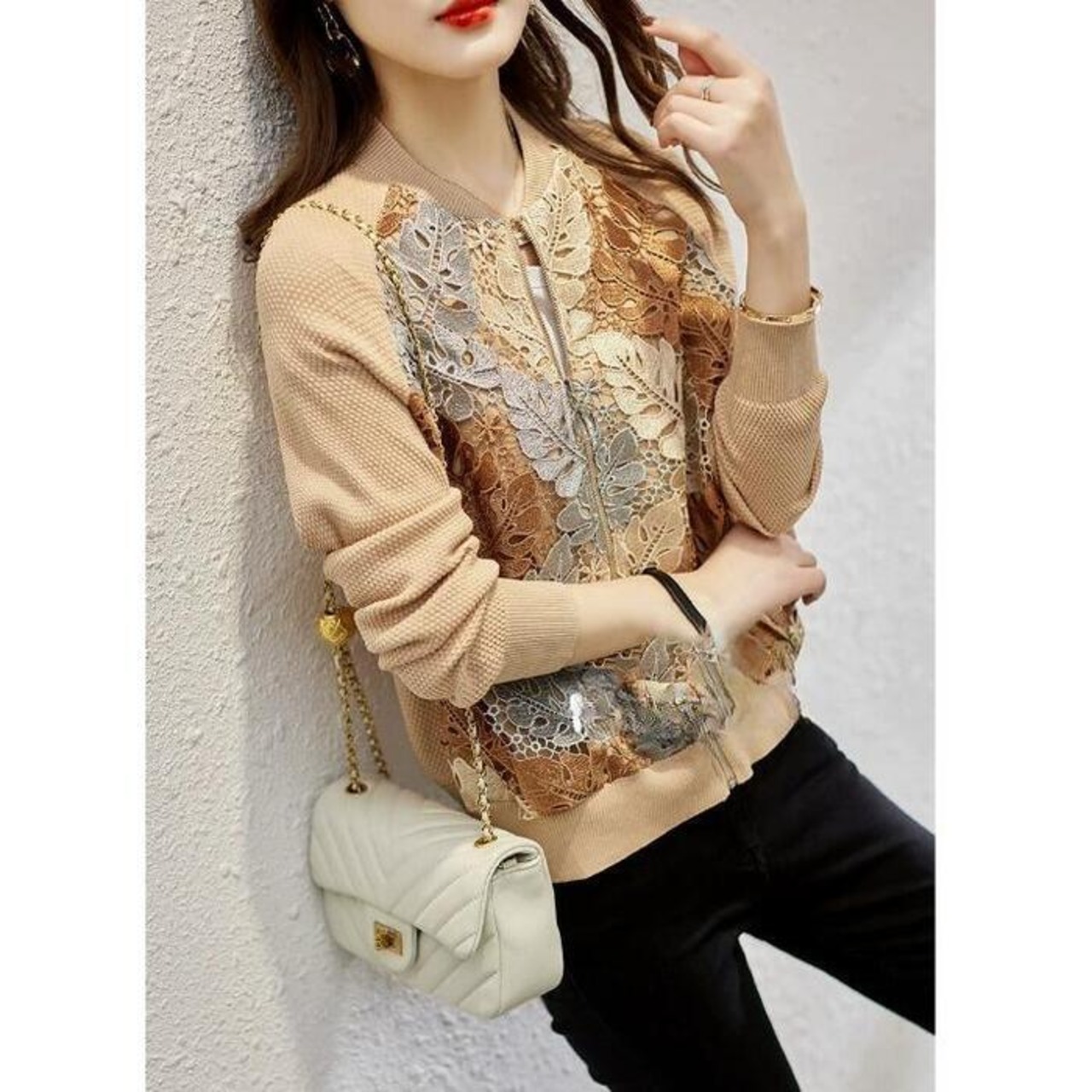 フロントのリーフ柄レースが目を惹くジップアップジャケット。