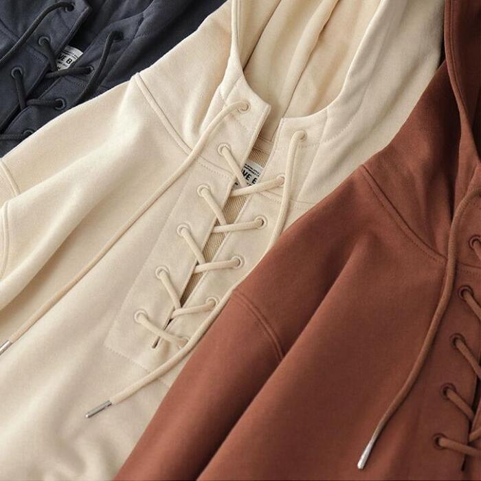全4色 大きいサイズ ゆったり トップス スウェット フーディー パーカー プルオーバー 長袖 レディース レースアップ きれいめ カジュアル 大人 可愛い おしゃれ 体型カバー オーバーサイズ ナチュラル ブラウン ベージュ グレー ブラック 黒 春 夏 秋 20代 30代 40代 50代