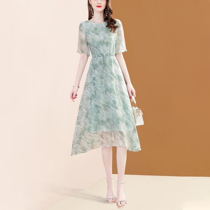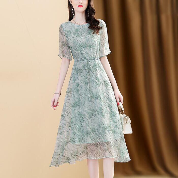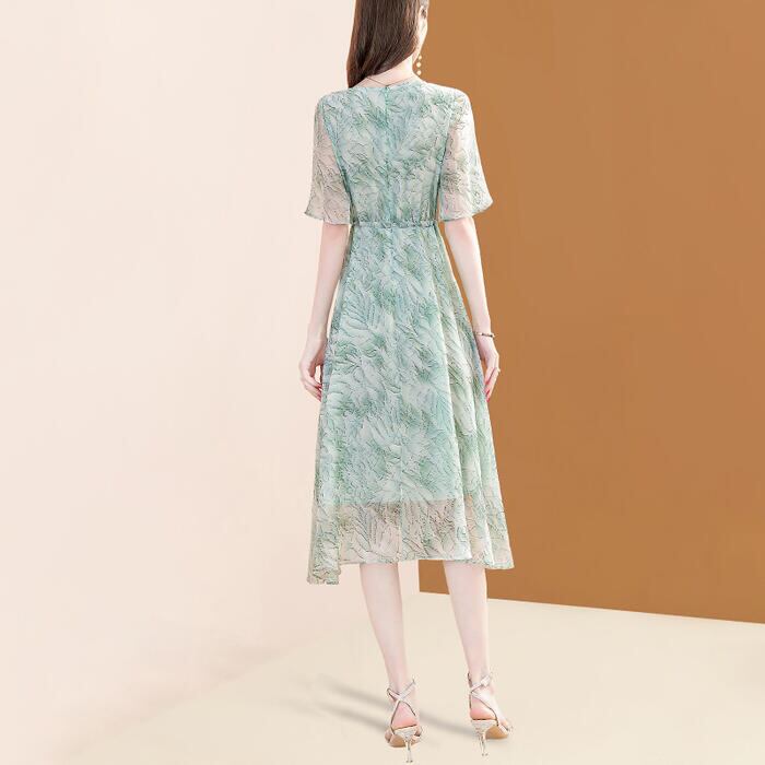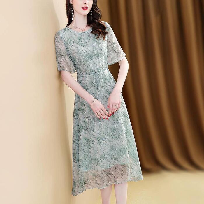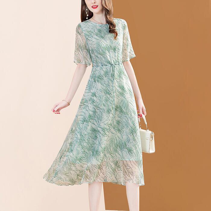 大きいサイズ ワンピース ドレス 袖あり フラワー 花柄 ボタニカル レディース エレガント きれいめ カジュアル ミモレ丈 大人 可愛い 半袖 フェミニン Aライン ドロスト 体型カバー ナチュラル 透け感 シフォン グリーン 緑 春 夏 秋 20代 30代 40代 50代