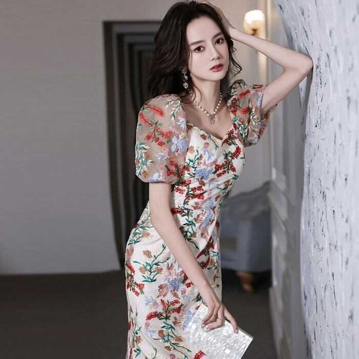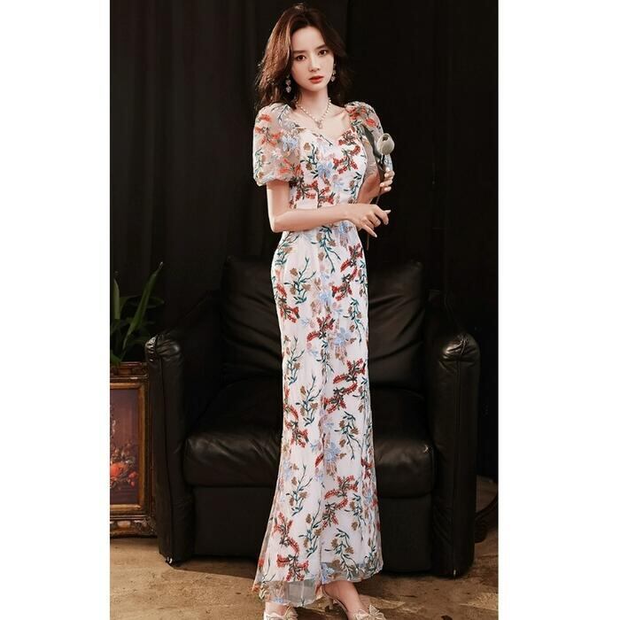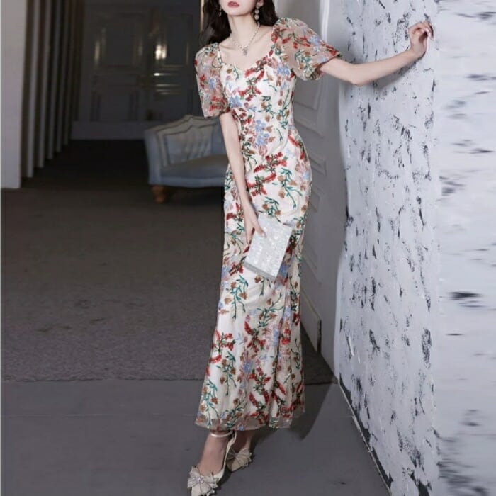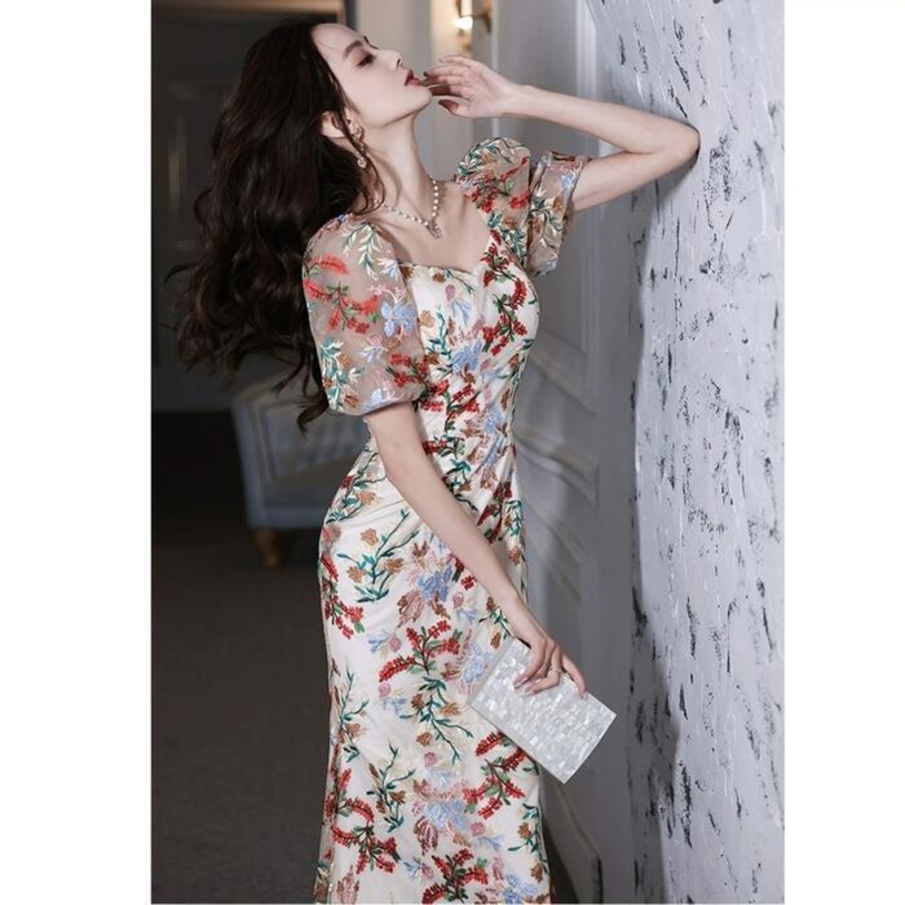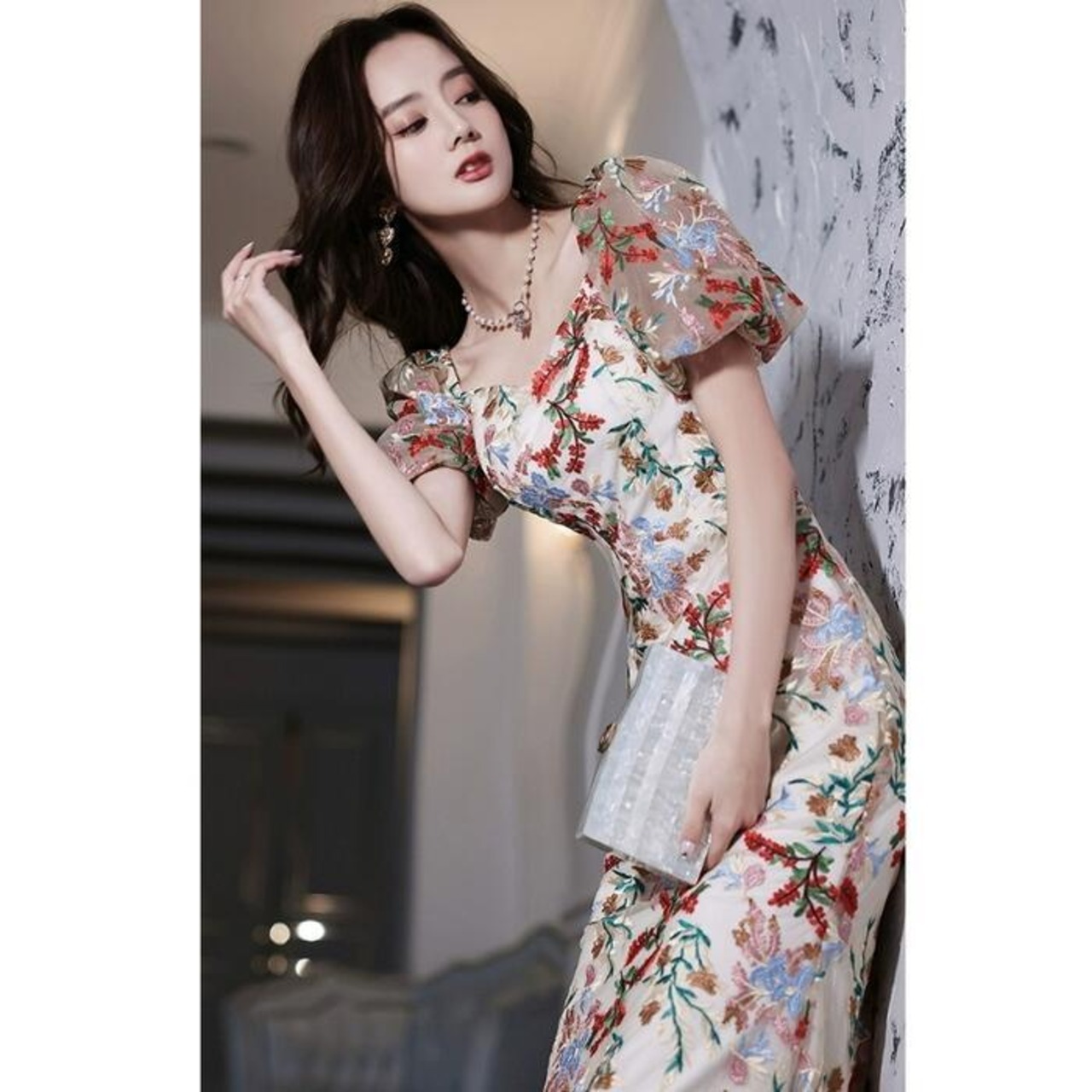 大きいサイズ マーメイド ワンピース ドレス 袖あり 花柄 刺繍 フラワー レディース エレガント きれいめ カジュアル ロング丈 ロングワンピ 大人 可愛い 半袖 フェミニン タイト スレンダー パーティー フォーマル セレモニー 二次会 春 夏 秋 20代 30代 40代 50代