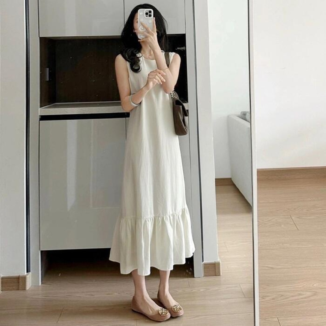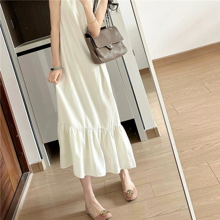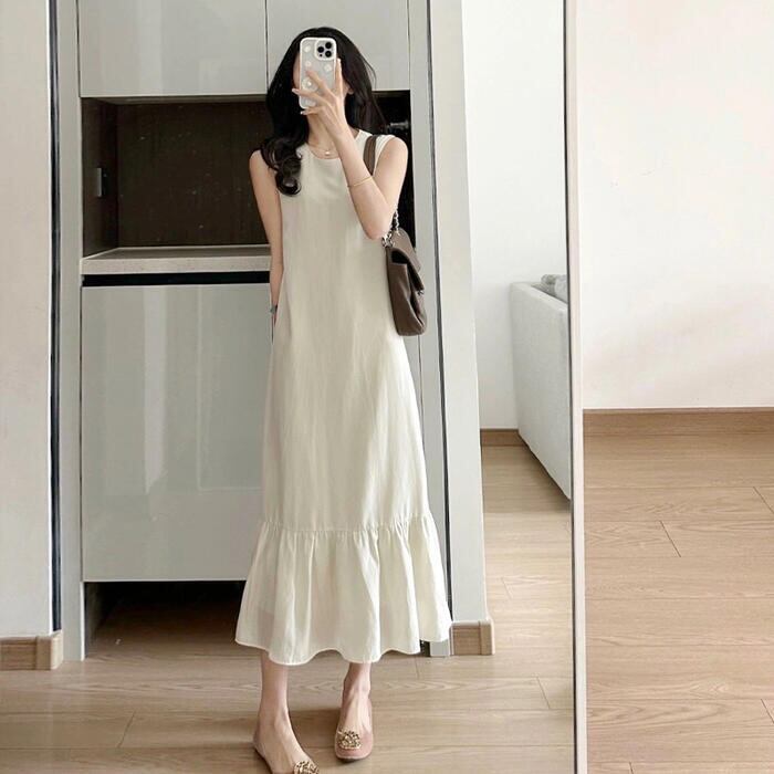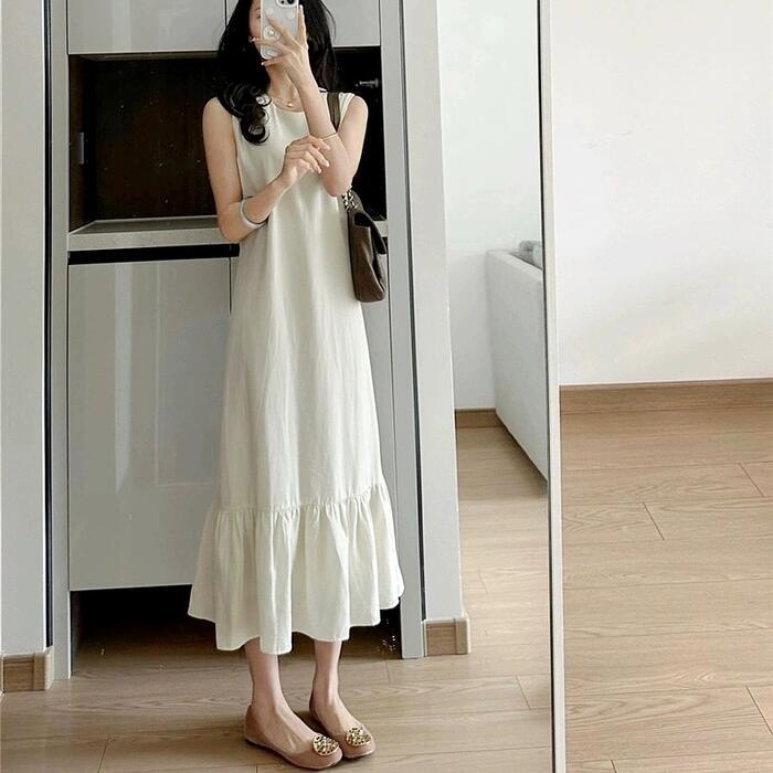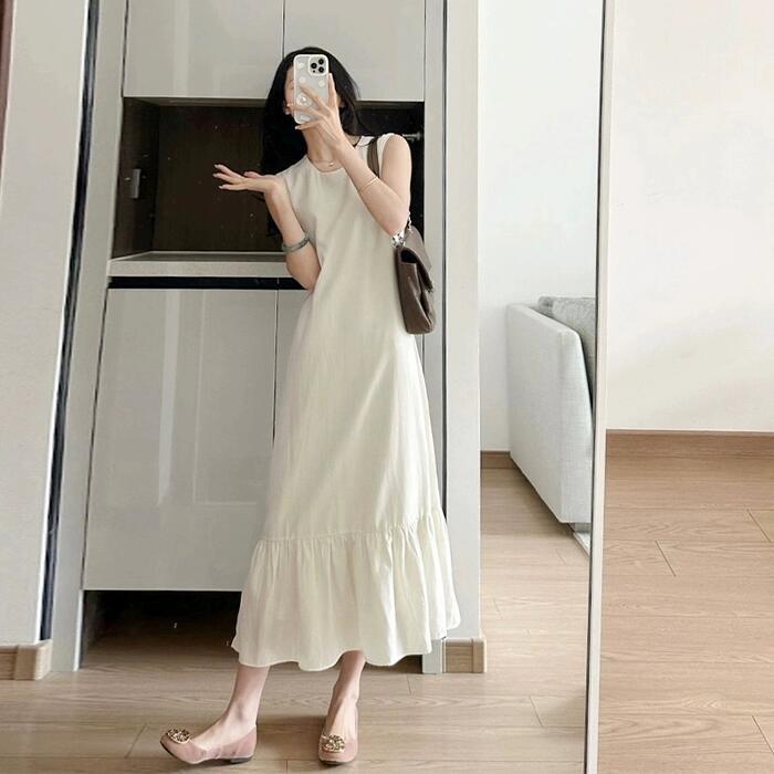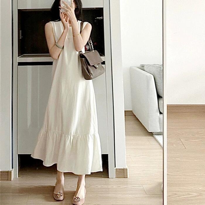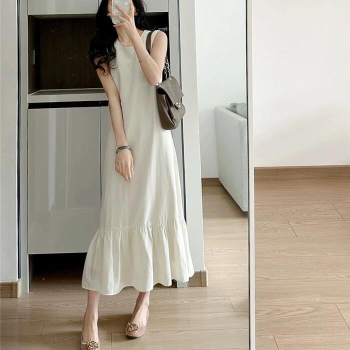 ワンピース ドレス フレア レディース きれいめ カジュアル ミモレ丈 ロングワンピ 大人 可愛い ノースリーブ フェミニン ゆったり リラックス シンプル 体型カバー 大きいサイズ 韓国 ベージュ 春 夏 秋 20代 30代 40代 50代