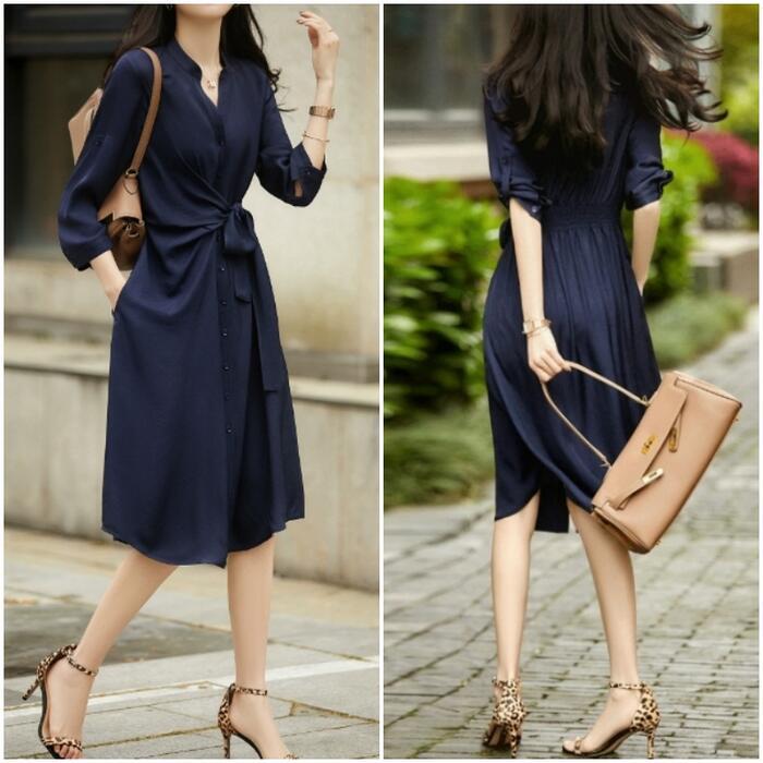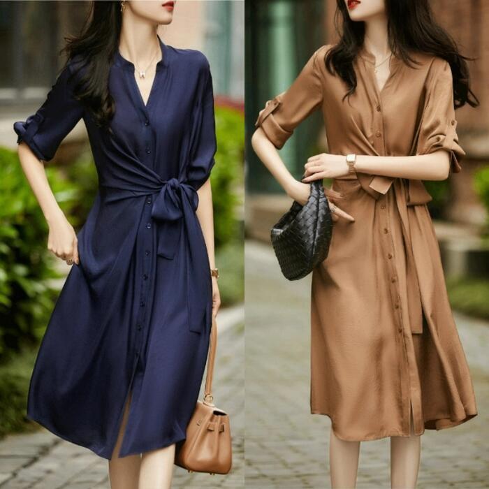 全2色 大きいサイズ ワンピース ドレス 袖あり レディース シャツワンピ エレガント きれいめ カジュアル ミモレ丈 七分袖 大人 可愛い シンプル フェミニン ウエストゴム ウエストリボン Aライン 体型カバー ネイビー ブラウン 春 夏 秋 20代 30代 40代 50代