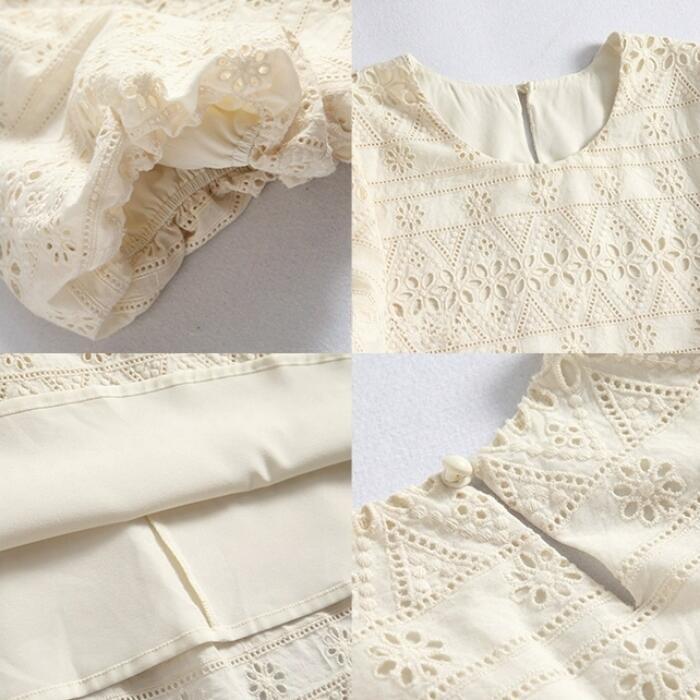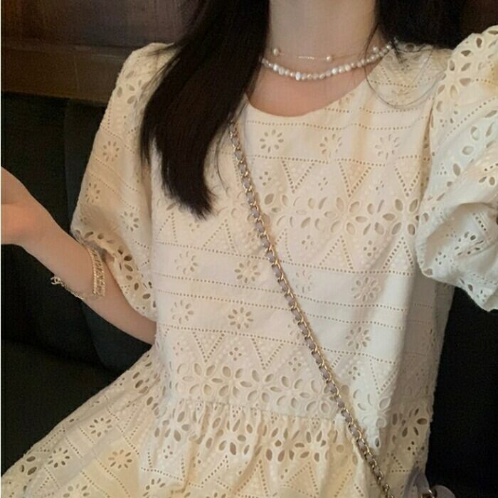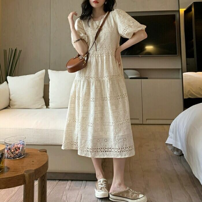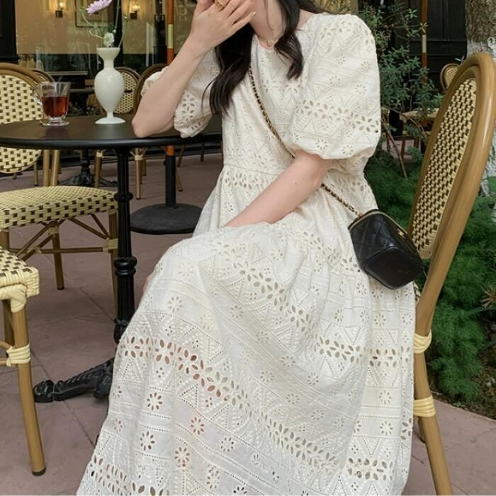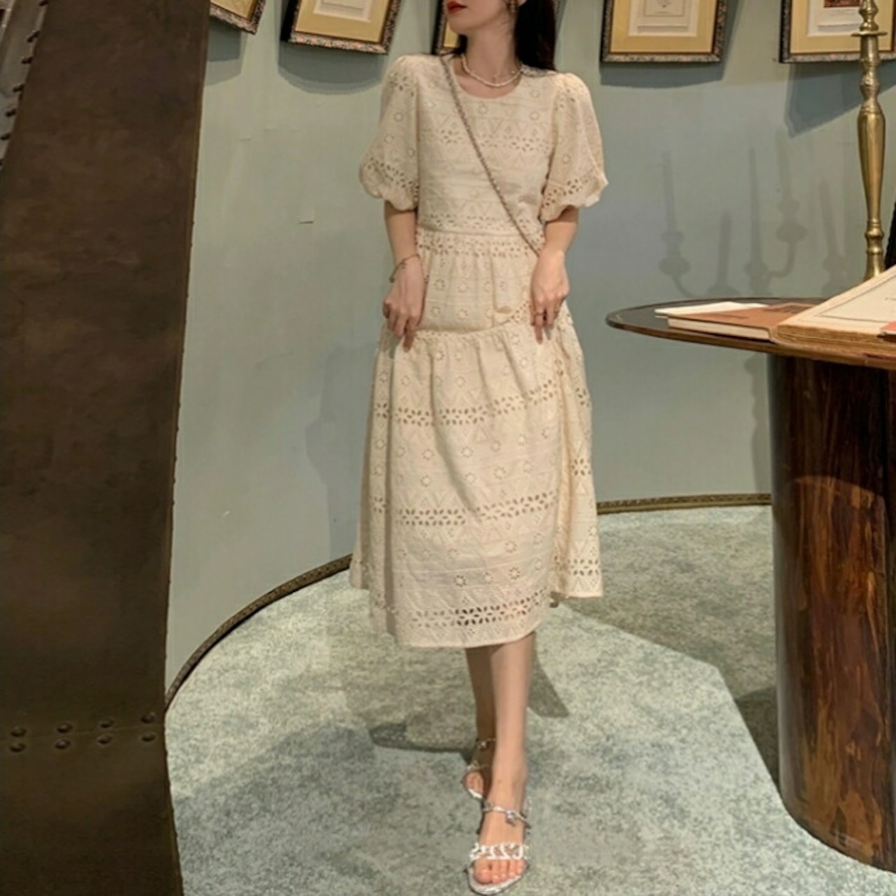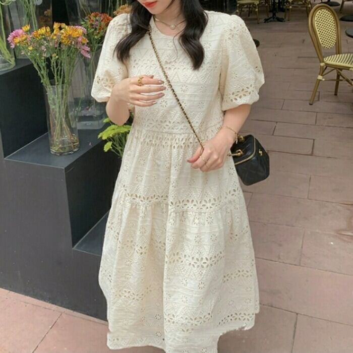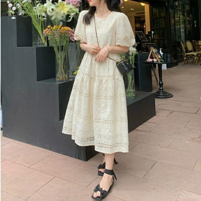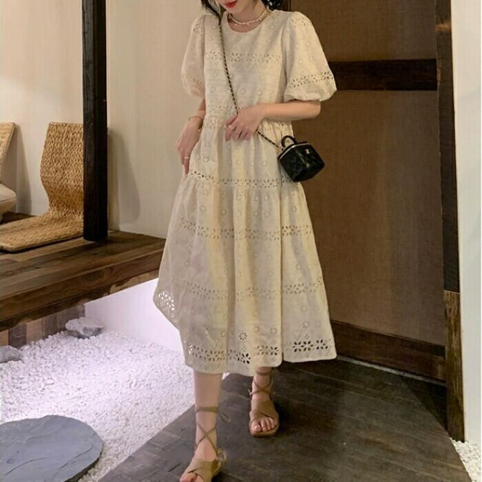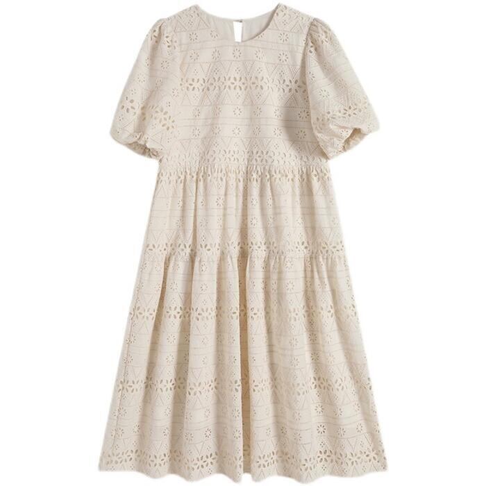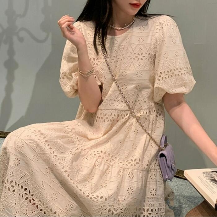 大きいサイズ パフスリーブ ワンピース ドレス 袖あり カットワーク レース レディース きれいめ カジュアル ミモレ丈 半袖 大人 可愛い フェミニン シンプル ゆったり 体型カバー ナチュラル リラックス 韓国 ベージュ 春 夏 秋 20代 30代 40代 50代