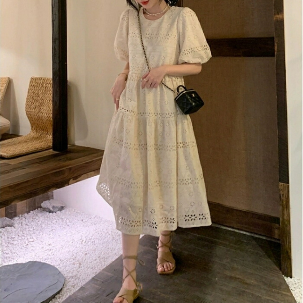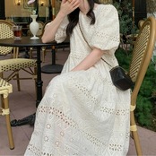 カットワークレースが大人可愛いパフスリーブワンピース。