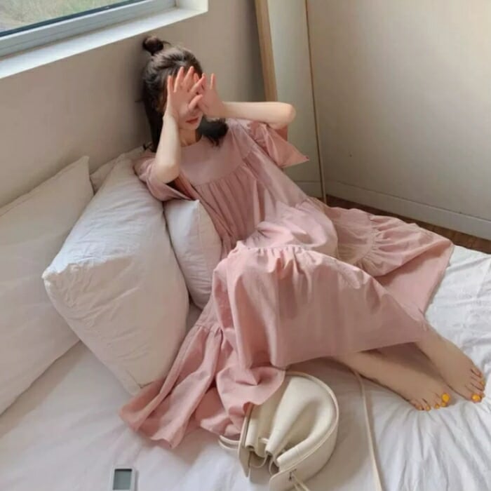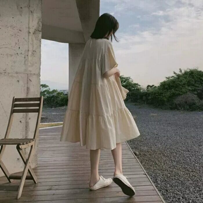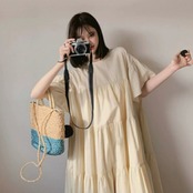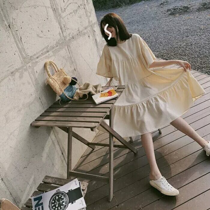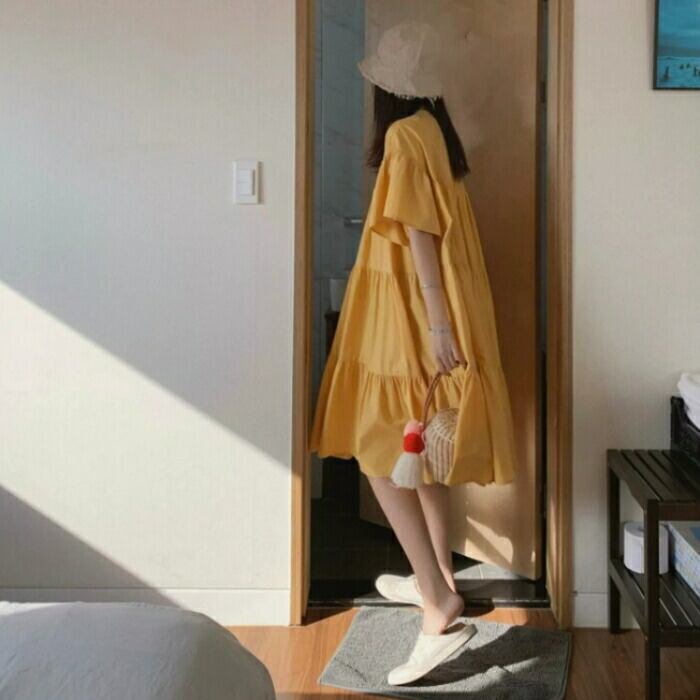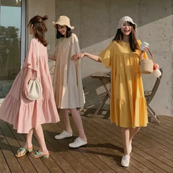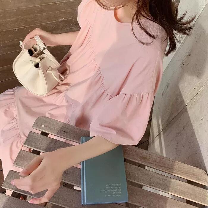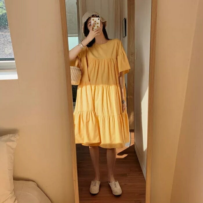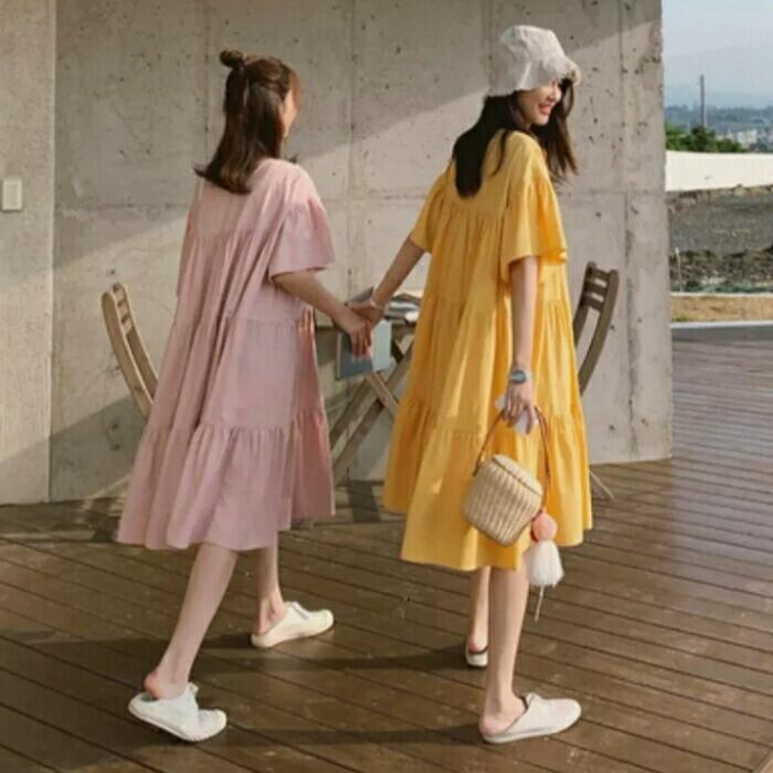 全3色 大きいサイズ ナチュラル リラックス ティアード ワンピース ドレス 袖あり チュニック レディース きれいめ カジュアル ミモレ丈 ひざ丈 半袖 五分袖 大人 可愛い フェミニン シンプル ゆったり 体型カバー 韓国 イエロー ピンク ベージュ 春 夏 秋 20代 30代 40代 50代