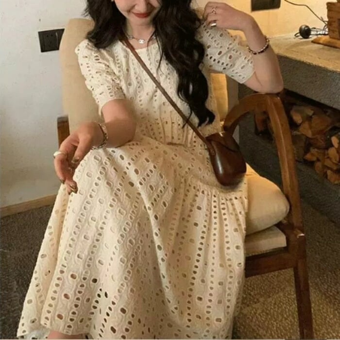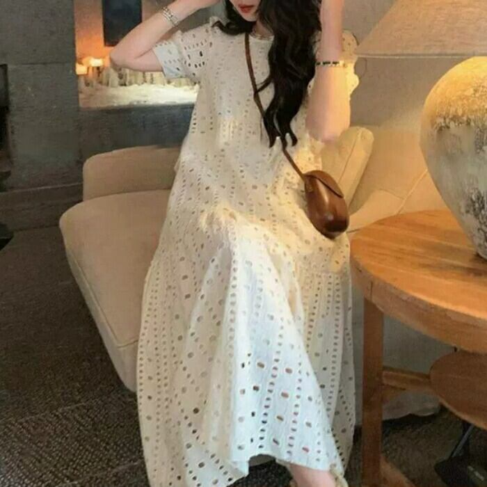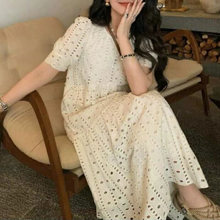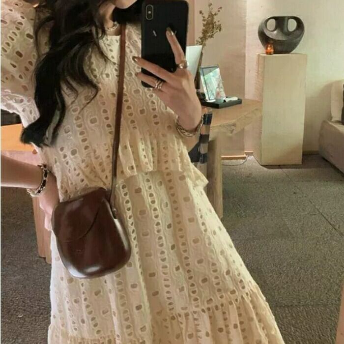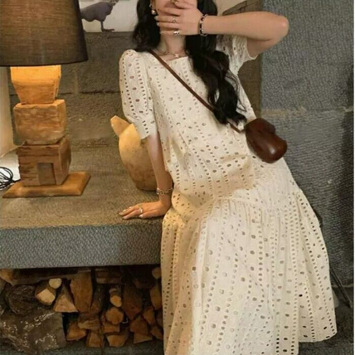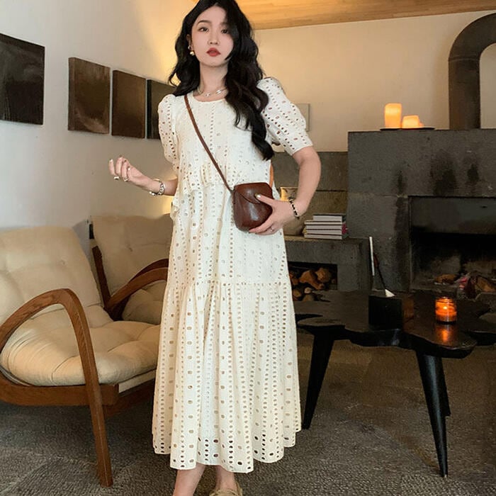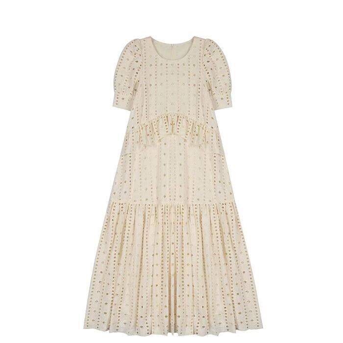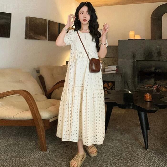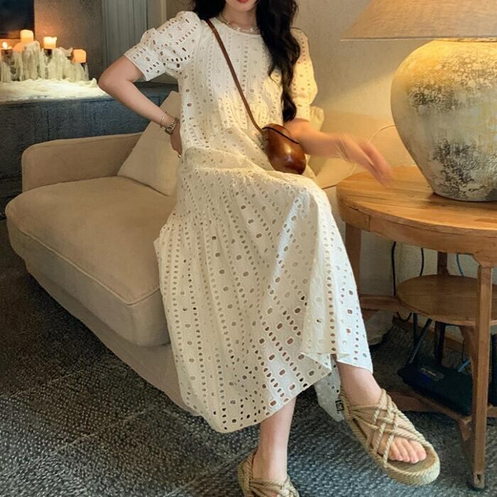 大きいサイズ ゆったり リラックス パフスリーブ ティアード ワンピース ドレス 袖あり カットワーク レース エレガント レディース きれいめ カジュアル ミモレ丈 半袖 大人 可愛い フェミニン 体型カバー Aライン ナチュラル 韓国 ホワイト 白 春 夏 秋 20代 30代 40代 50代