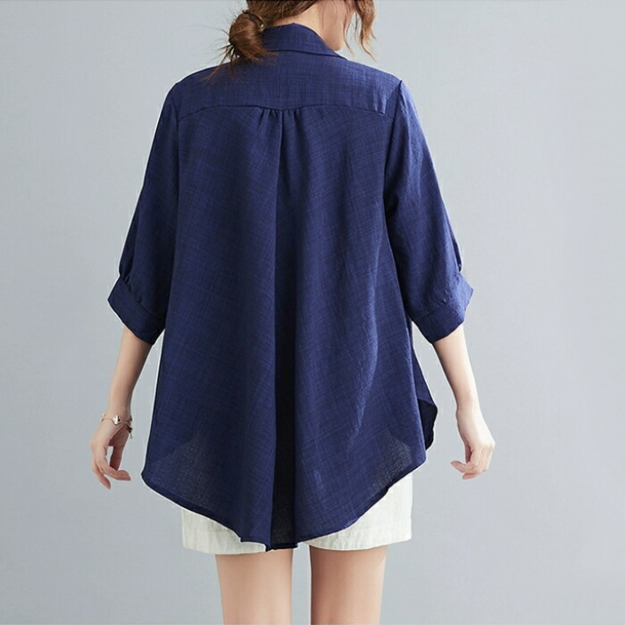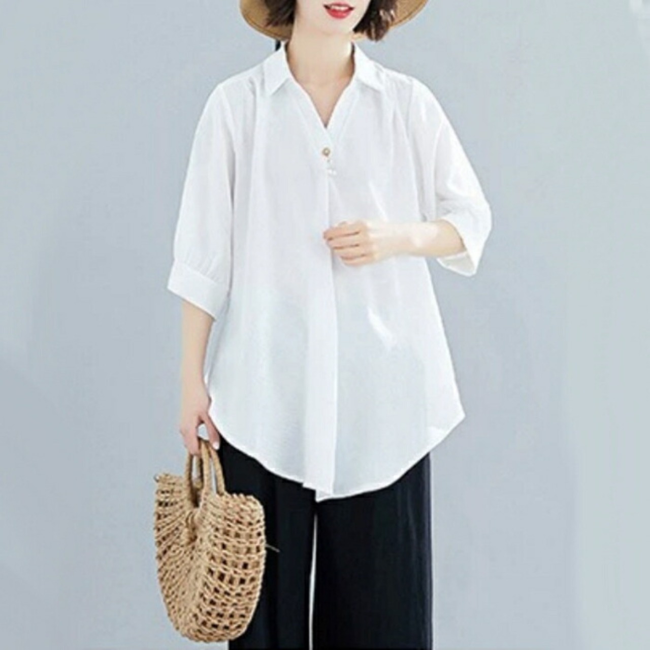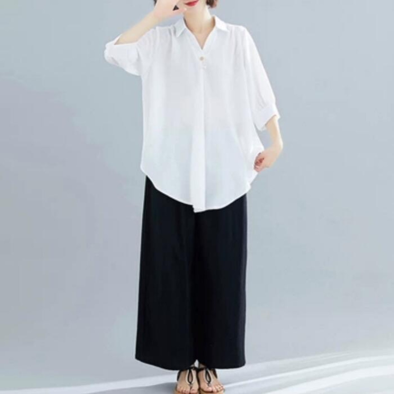 全5色 大きいサイズ シンプル トップス シャツ ブラウス プルオーバー チャーム レディース リネン混 麻 きれいめ カジュアル 七分袖 大人 可愛い フェミニン ゆったり オーバーサイズ 体型カバー ピンク 青 ブルー ホワイト 白 ブラック 黒 ネイビー 春 夏 秋 20代 30代 40代 50代