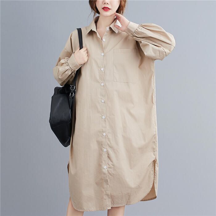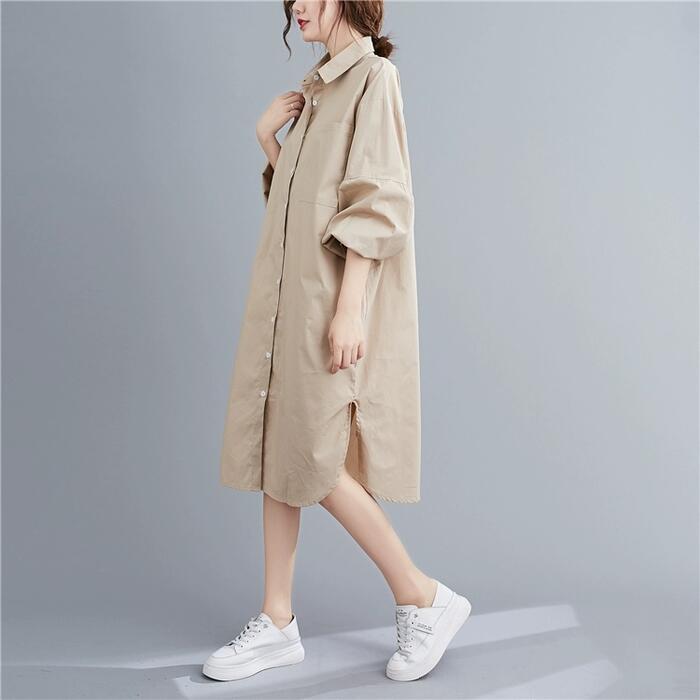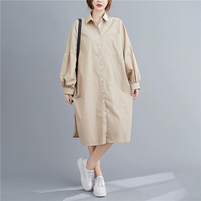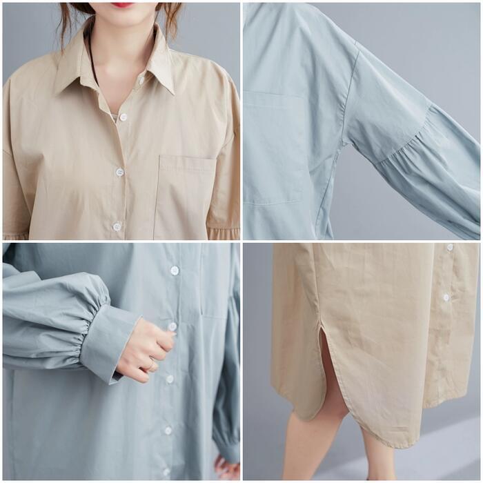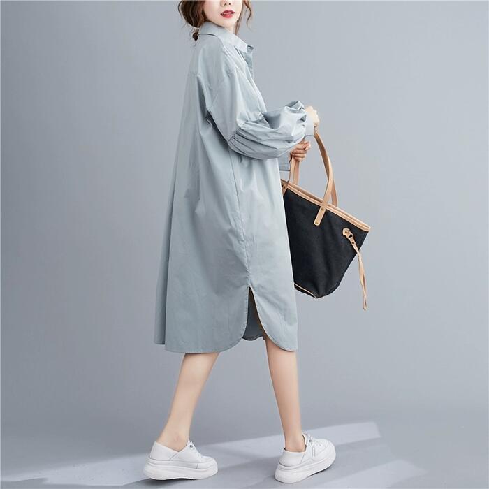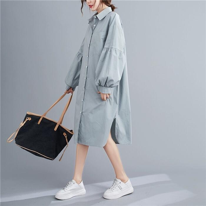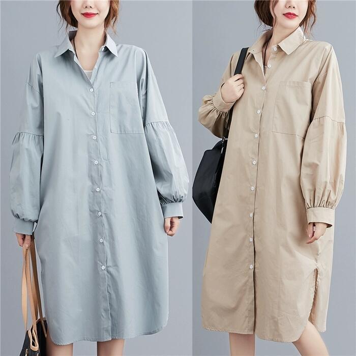 全2色 シンプル ナチュラル リラックス ワンピース ドレス 袖あり シャツワンピ パフスリーブ レディース きれいめ カジュアル ミモレ丈 長袖 大人 可愛い フェミニン ゆったり 体型カバー オーバーサイズ 羽織り レイヤード ブルー 青 ベージュ 春 夏 秋 20代 30代 40代 50代