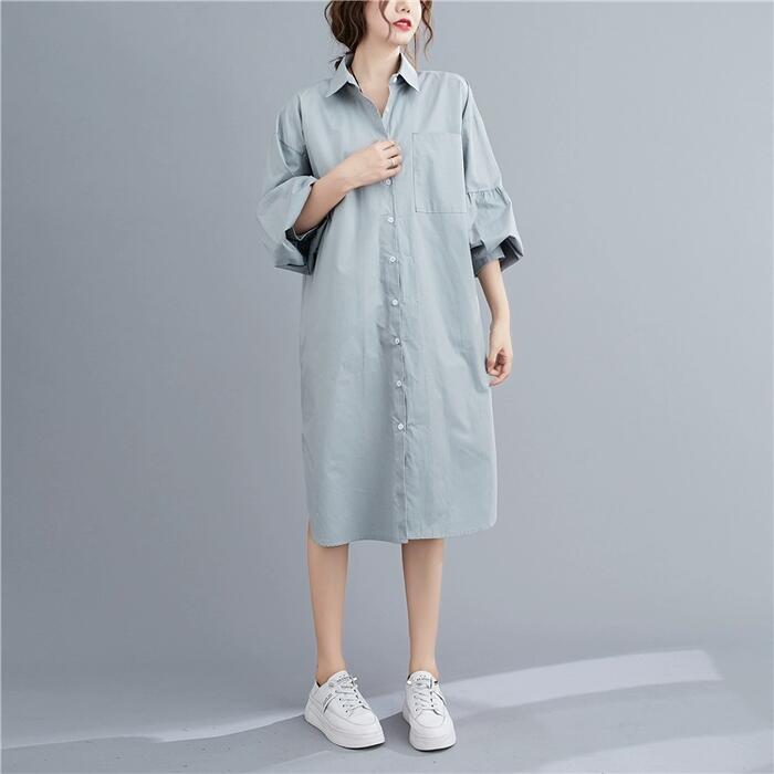 ゆったりシルエットのシャツワンピース。