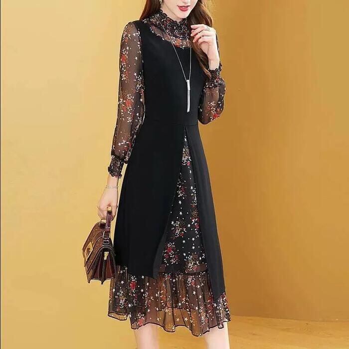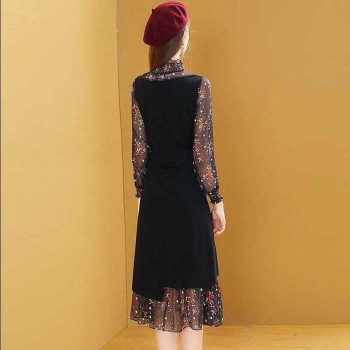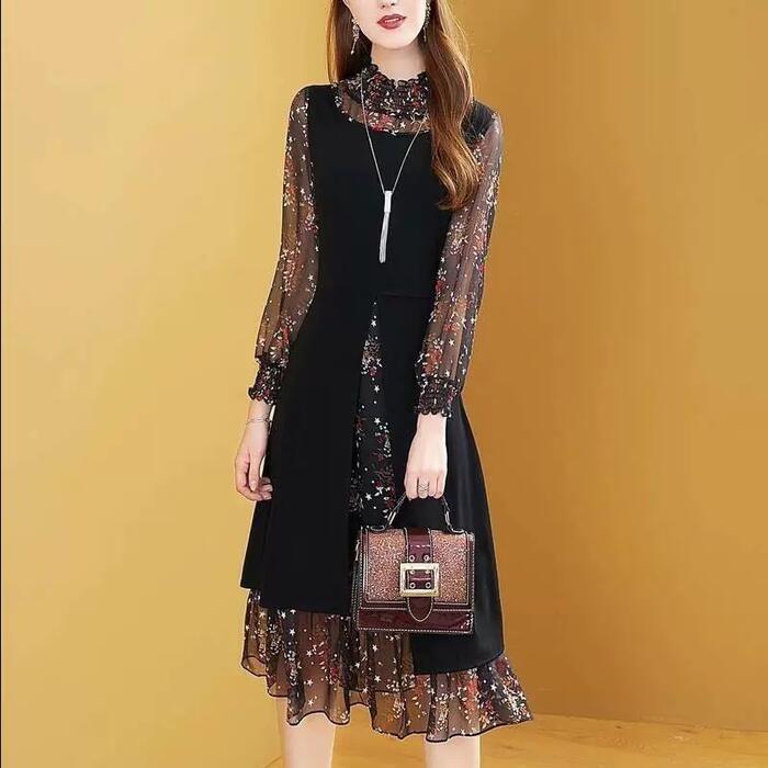 大きいサイズ レイヤード風 ワンピース ドレス 袖あり レディース エレガント きれいめ カジュアル ミモレ丈 ハイネック 花柄 大人 可愛い フェミニン 体型カバー シアー 透け感 ハイウエスト Aライン ブラック 黒 春 夏 秋 20代 30代 40代 50代