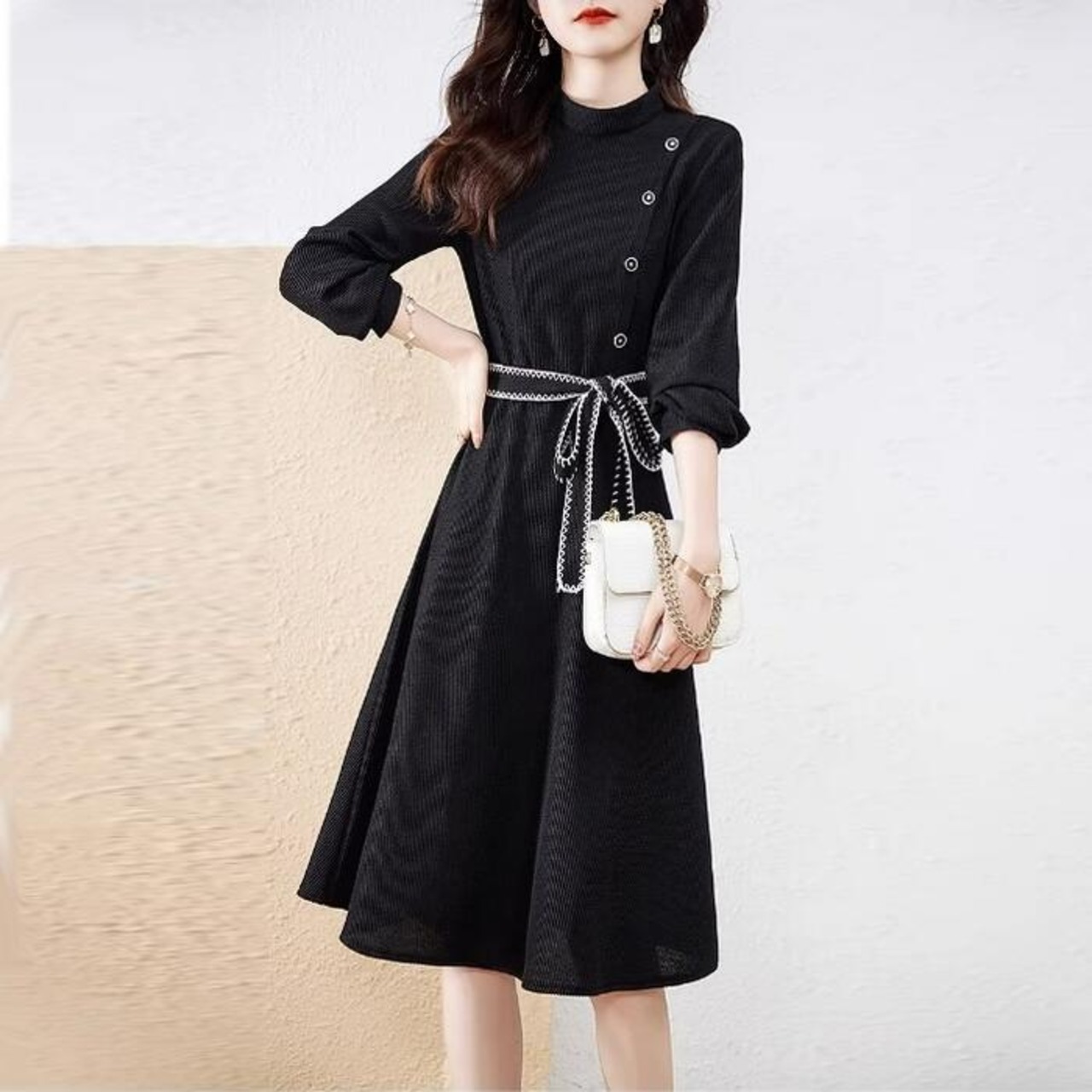 ウエストリボンが女性らしいアクセントになったスタンドカラーワンピース。