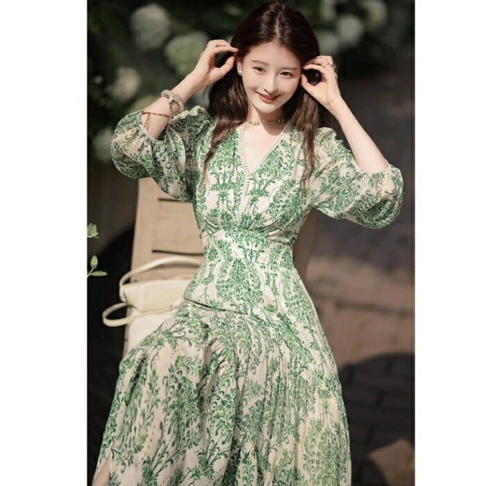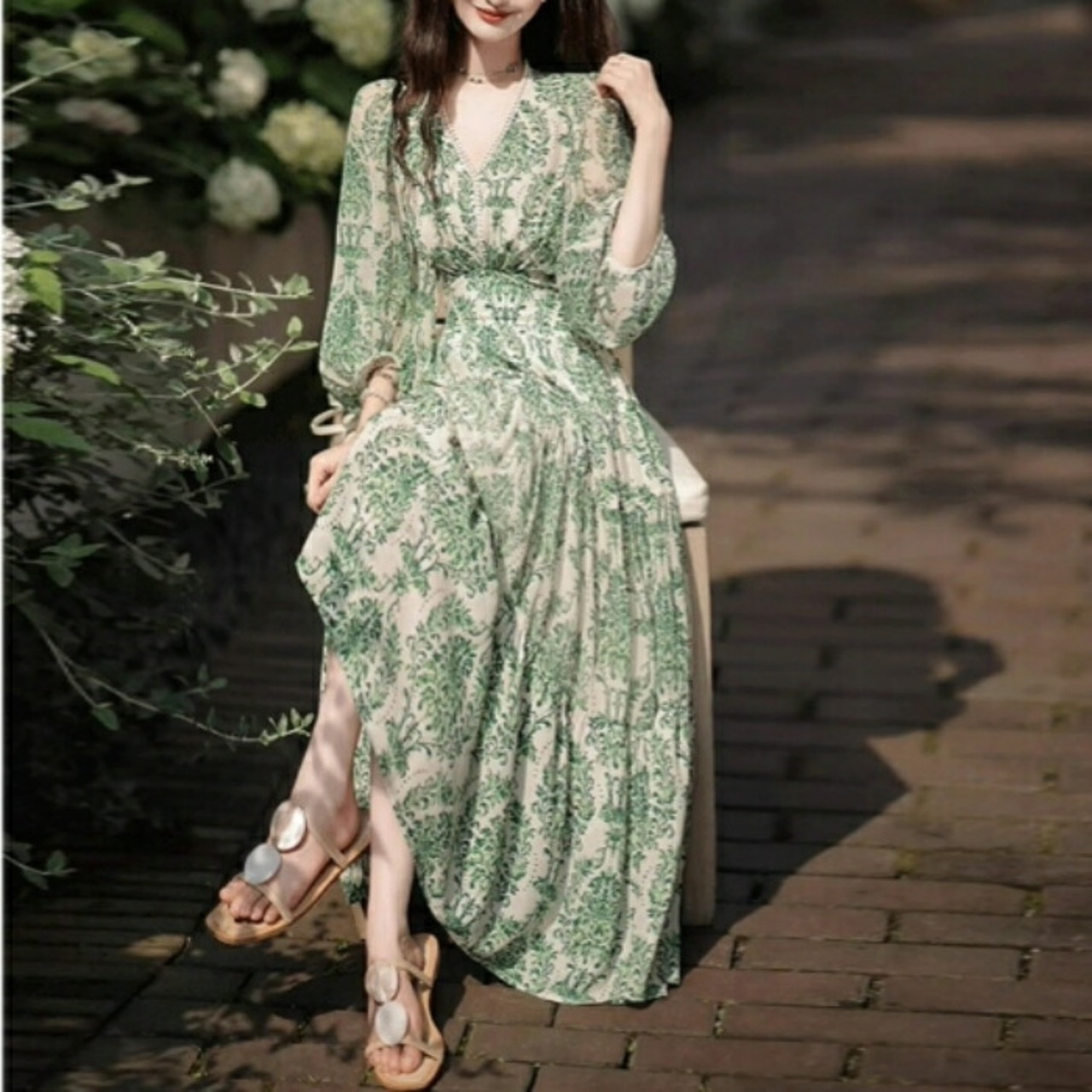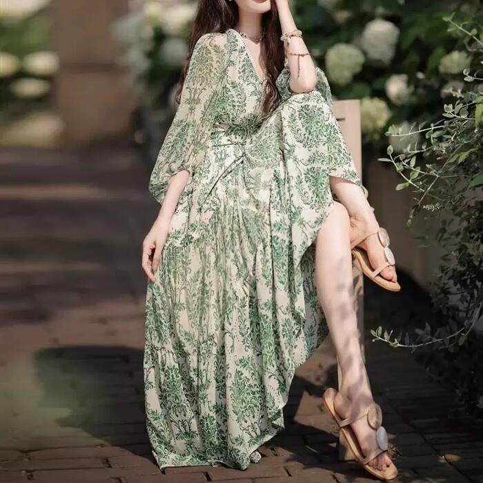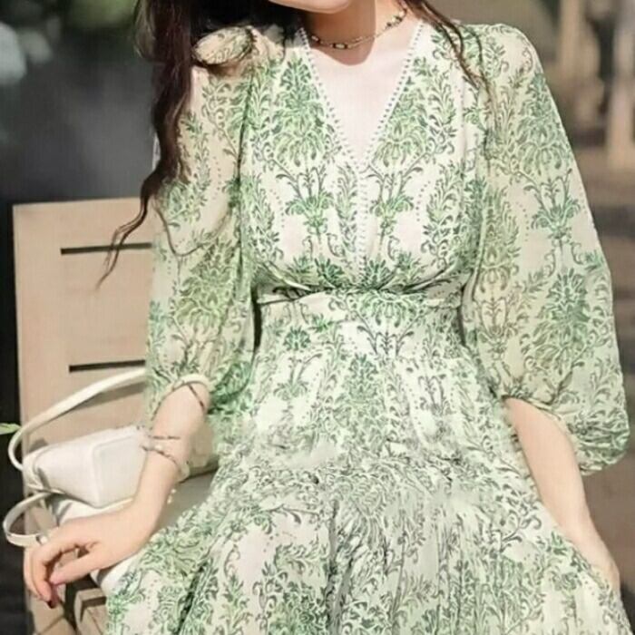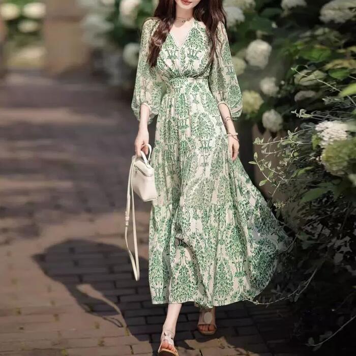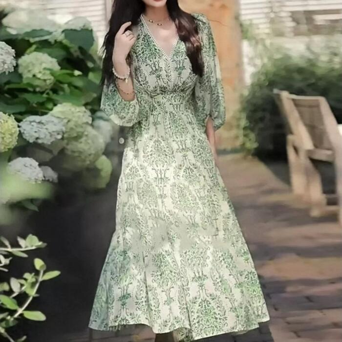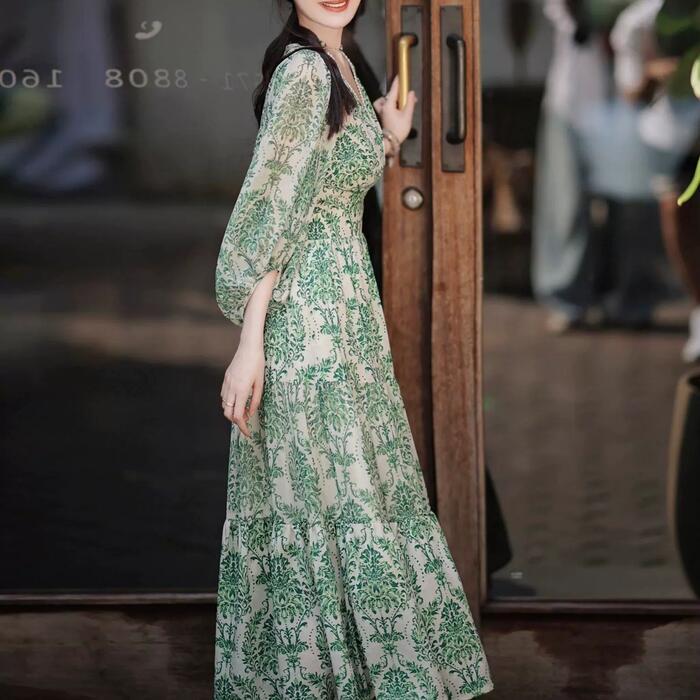 ワンピース ドレス 袖あり ボタニカル レース Vネック レディース きれいめ カジュアル ミモレ丈 七分袖 大人 可愛い フェミニン 体型カバー ハイウエスト 透け感 シアー フレア Aライン ナチュラル グリーン 緑 春 夏 秋 20代 30代 40代 50代