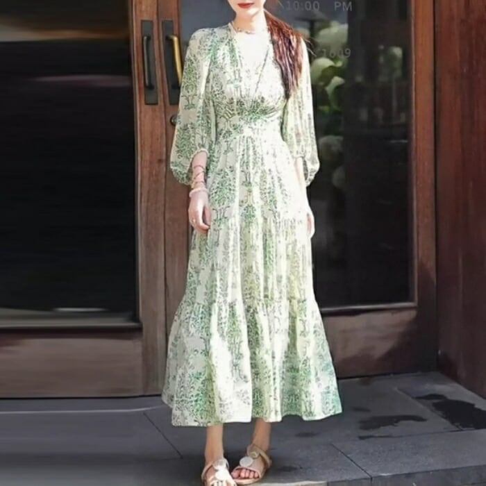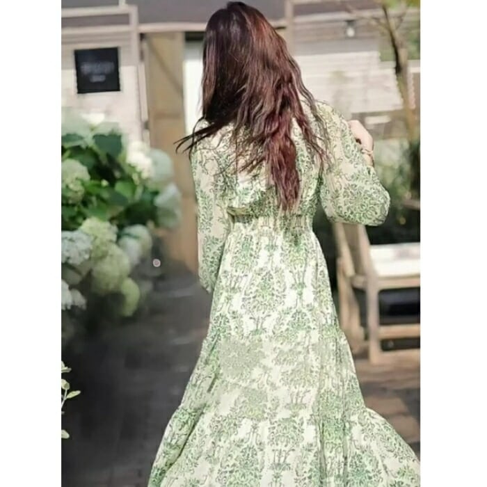 ボタニカル調な柄をプリントしたロングワンピース。