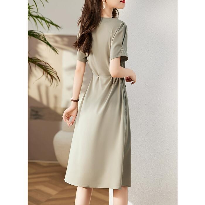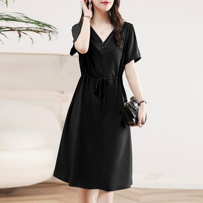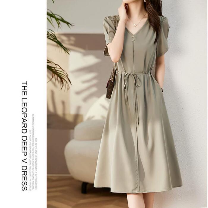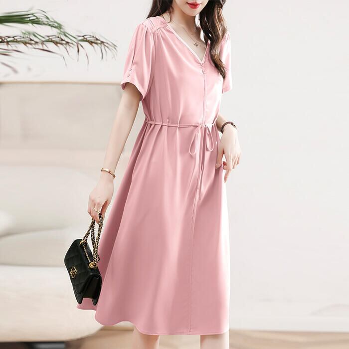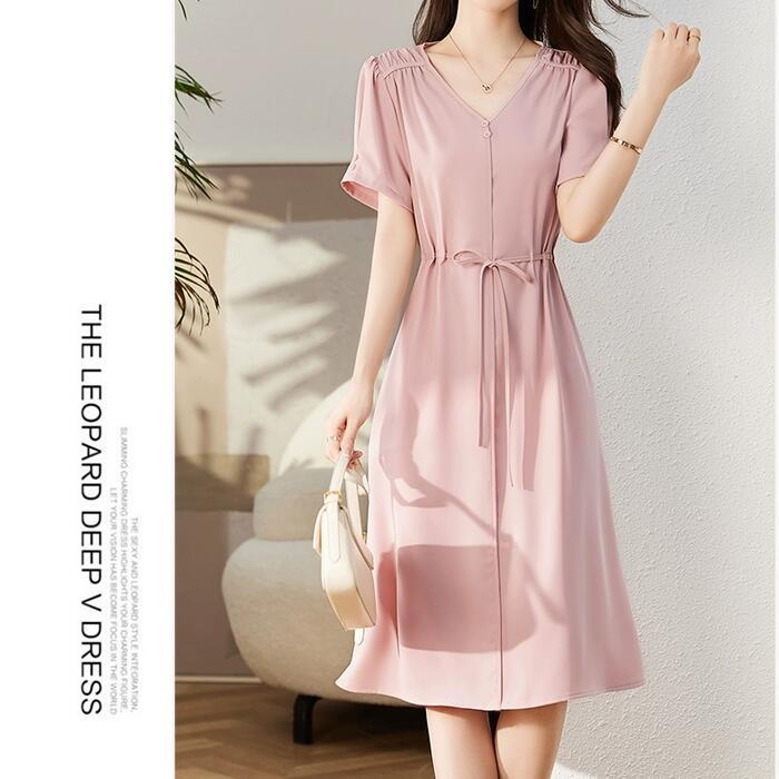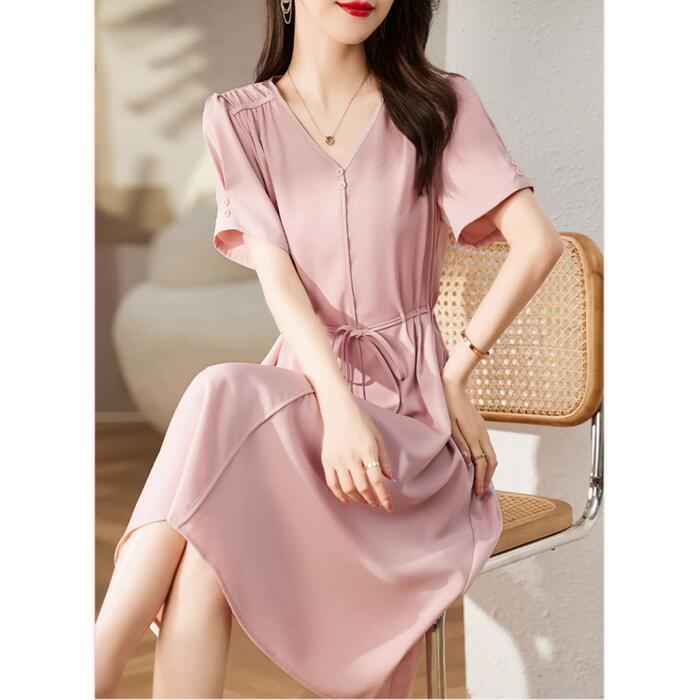 全3色 大きいサイズ ワンピース ドレス 袖あり Vネック レディース エレガント きれいめ カジュアル ミモレ丈 半袖 大人 可愛い フェミニン ハイウエスト ウエストリボン シンプル Aライン ナチュラル ピンク グリーン 緑 ブラック 黒 春 夏 秋 20代 30代 40代 50代