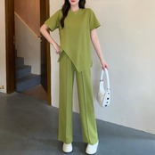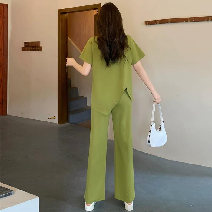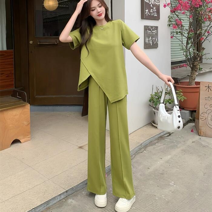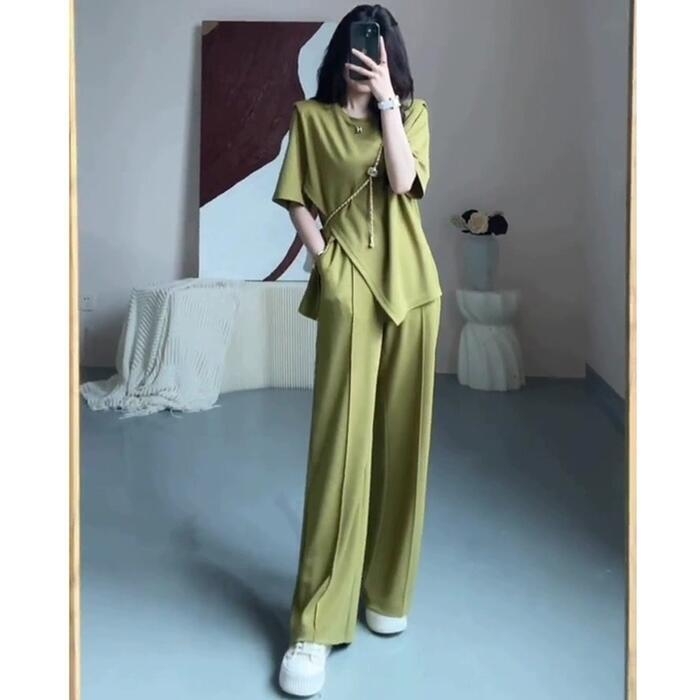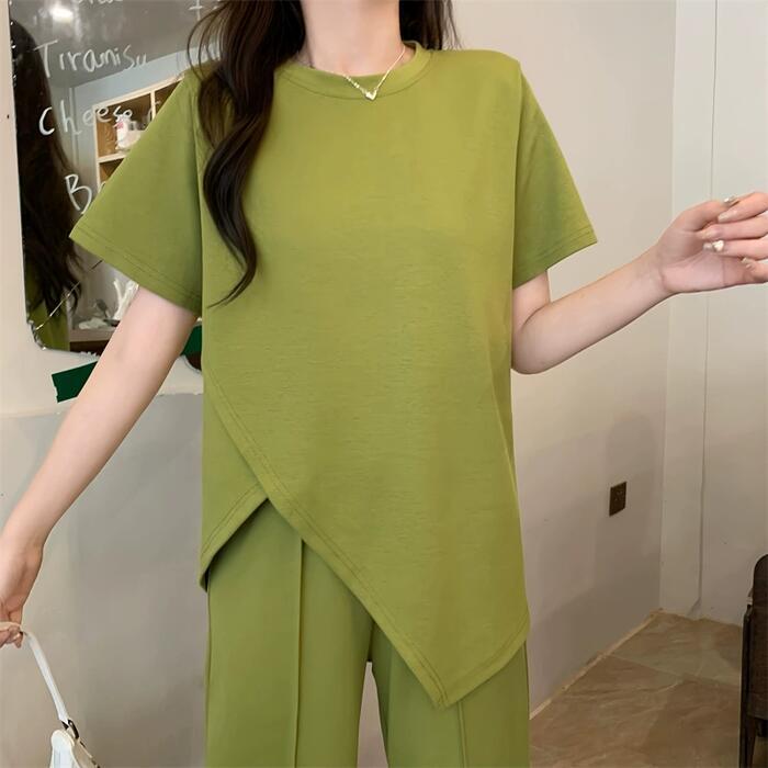 大きいサイズ セットアップ 2点セット トップス パンツ カットソー アシンメトリー ロングパンツ レディース エレガント きれいめ カジュアル 大人 可愛い フェミニン 半袖 体型カバー ナチュラル リラックス グリーン 緑 春 秋 夏 20代 30代 40代 50代