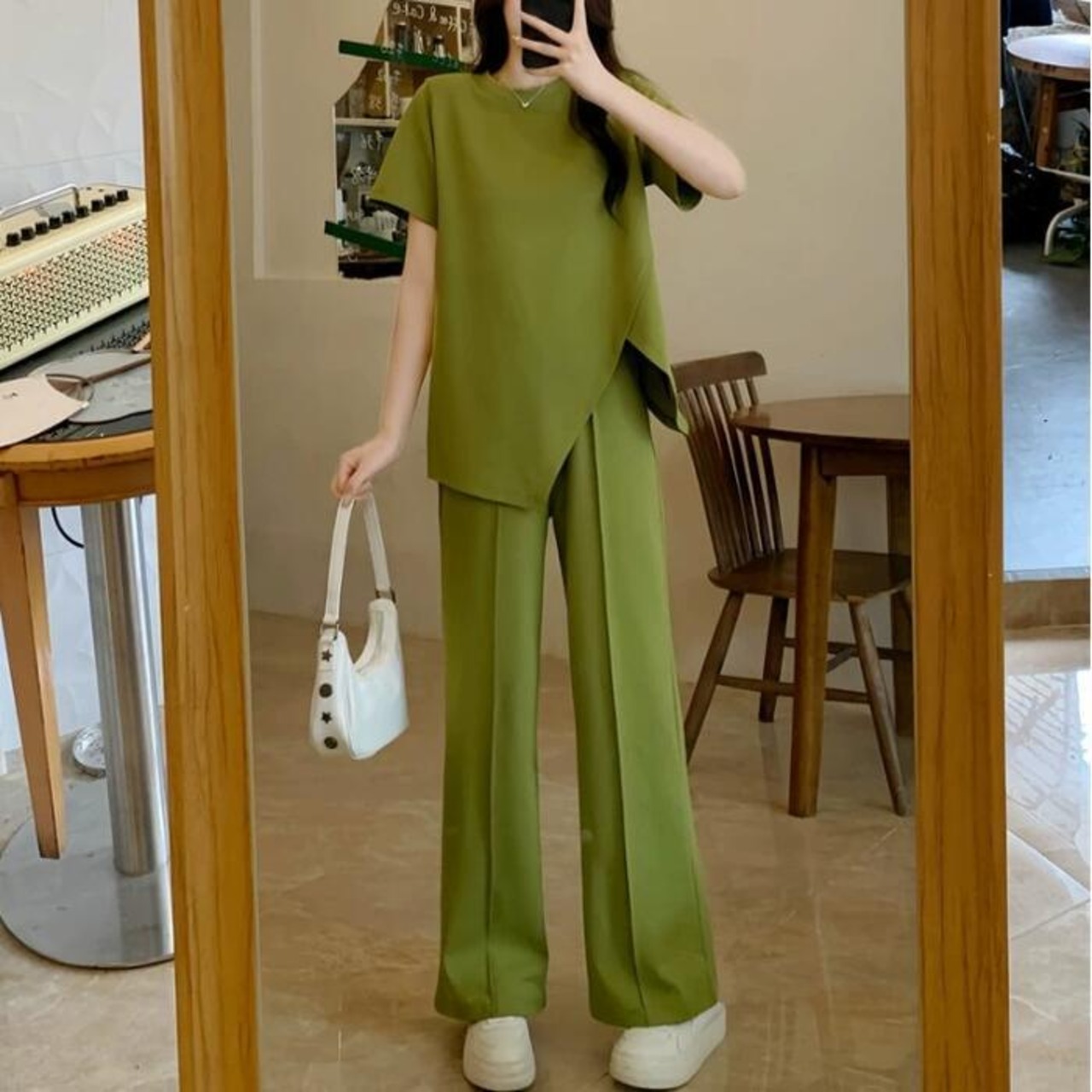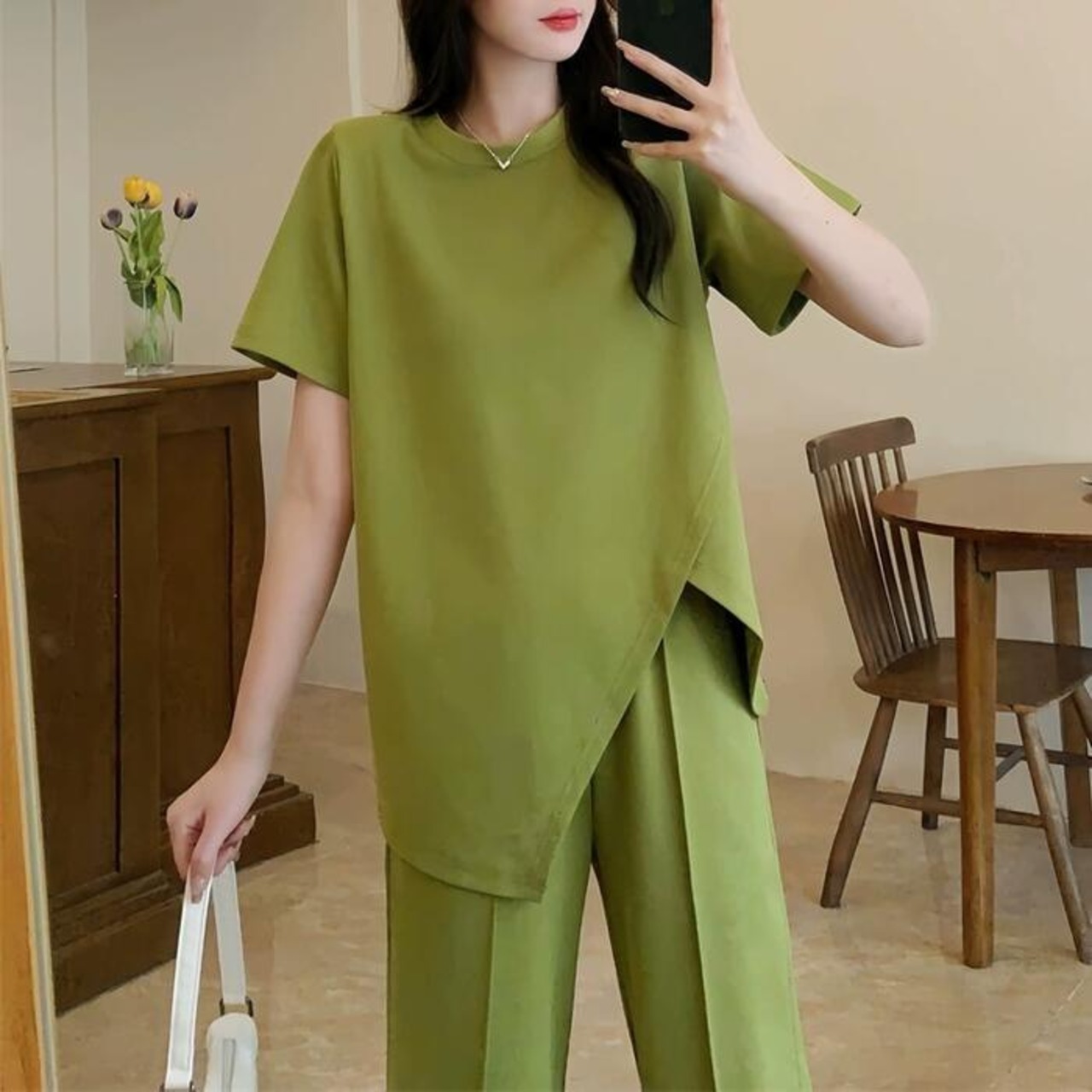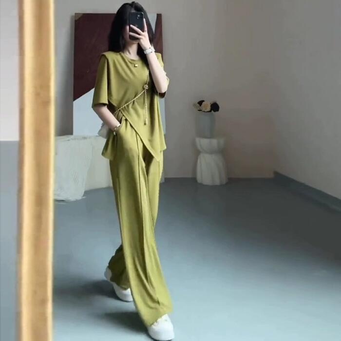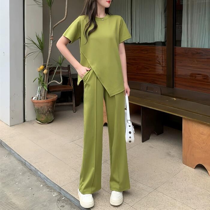 アシンメトリーなTシャツ&ワイドレッグパンツのセットアップ。